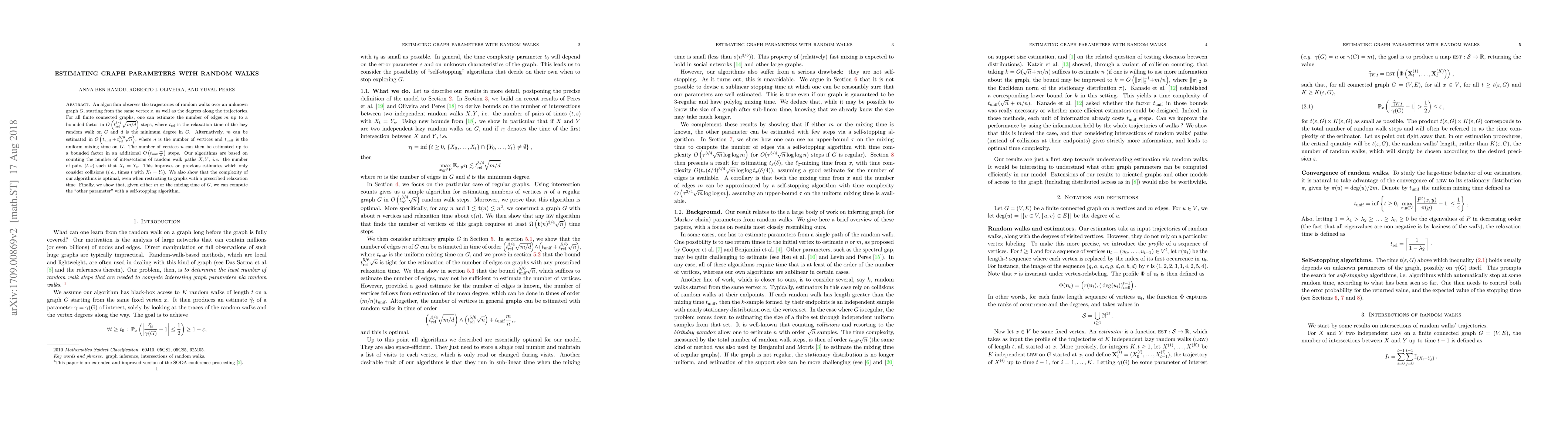 An algorithm observes the trajectories of random walks over an unknown graph $G$, starting from the same vertex $x$, as well as the degrees along the trajectories. For all finite connected graphs, one can estimate the number of edges $m$ up to a bounded factor in $O\left(t_{\mathrm{rel}}^{3/4}\sqrt{m/d}\right)$ steps, where $t_{\mathrm{rel}}$ is the relaxation time of the lazy random walk on $G$ and $d$ is the minimum degree in $G$. Alternatively, $m$ can be estimated in $O\left(t_{\mathrm{unif}} +t_{\mathrm{rel}}^{5/6}\sqrt{n}\right)$, where $n$ is the number of vertices and $t_{\mathrm{unif}}$ is the uniform mixing time on $G$. The number of vertices $n$ can then be estimated up to a bounded factor in an additional $O\left(t_{\mathrm{unif}}\frac{m}{n}\right)$ steps. Our algorithms are based on counting the number of intersections of random walk paths $X,Y$, i.e. the number of pairs $(t,s)$ such that $X_t=Y_s$. This improves on previous estimates which only consider collisions (i.e., times $t$ with $X_t=Y_t$). We also show that the complexity of our algorithms is optimal, even when restricting to graphs with a prescribed relaxation time. Finally, we show that, given either $m$ or the mixing time of $G$, we can compute the "other parameter" with a self-stopping algorithm.
