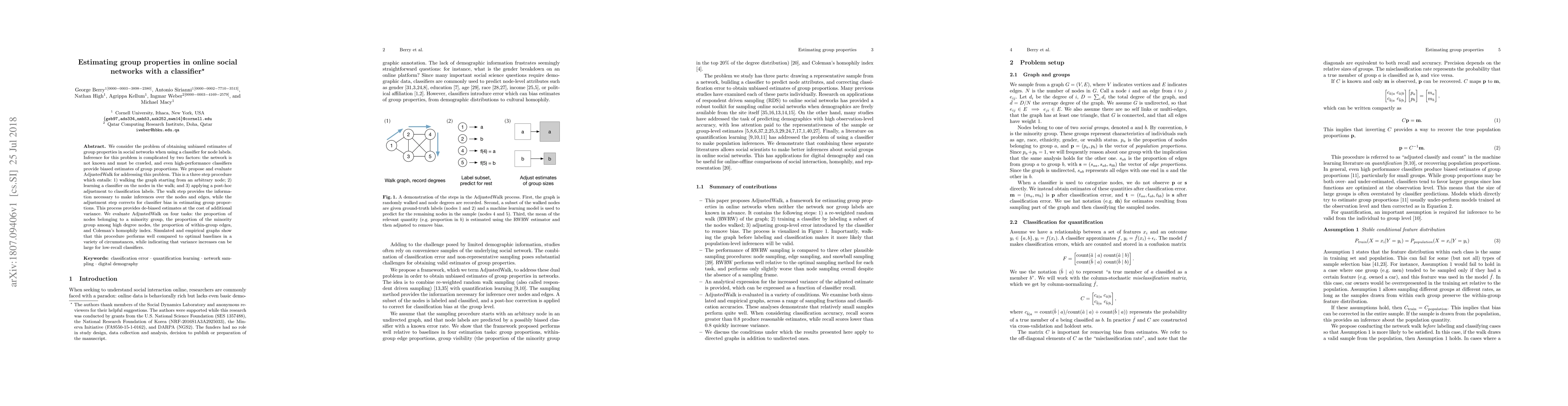 This paper proposes AdjustedWalk, a three-step method to estimate unbiased group properties in online social networks using a classifier, addressing the challenges of network crawling and classifier bias. The method shows promising performance in estimating group proportions and related metrics, though it introduces additional variance.
