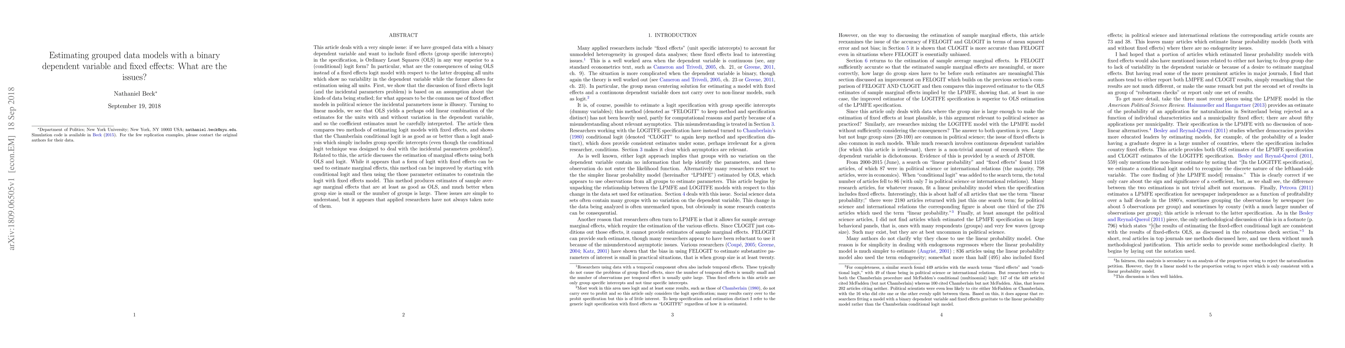 This article deals with asimple issue: if we have grouped data with a binary dependent variable and want to include fixed effects (group specific intercepts) in the specification, is Ordinary Least Squares (OLS) in any way superior to a (conditional) logit form? In particular, what are the consequences of using OLS instead of a fixed effects logit model with respect to the latter dropping all units which show no variability in the dependent variable while the former allows for estimation using all units. First, we show that the discussion of fthe incidental parameters problem is based on an assumption about the kinds of data being studied; for what appears to be the common use of fixed effect models in political science the incidental parameters issue is illusory. Turning to linear models, we see that OLS yields a linear combination of the estimates for the units with and without variation in the dependent variable, and so the coefficient estimates must be carefully interpreted. The article then compares two methods of estimating logit models with fixed effects, and shows that the Chamberlain conditional logit is as good as or better than a logit analysis which simply includes group specific intercepts (even though the conditional logit technique was designed to deal with the incidental parameters problem!). Related to this, the article discusses the estimation of marginal effects using both OLS and logit. While it appears that a form of logit with fixed effects can be used to estimate marginal effects, this method can be improved by starting with conditional logit and then using the those parameter estimates to constrain the logit with fixed effects model. This method produces estimates of sample average marginal effects that are at least as good as OLS, and much better when group size is small or the number of groups is large. .