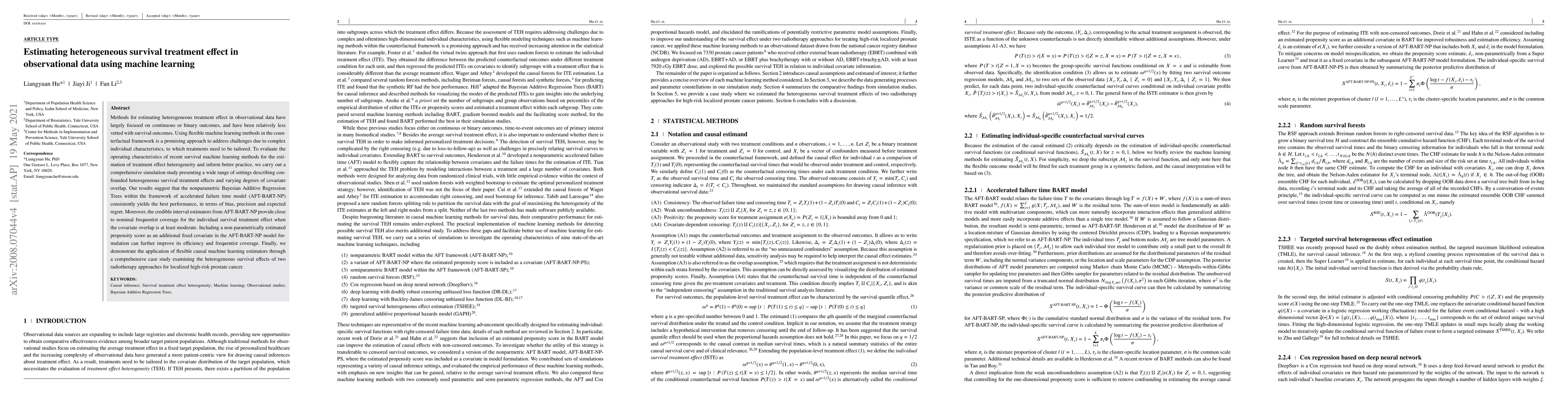 This paper evaluates machine learning methods for estimating heterogeneous treatment effects in survival data, finding that the AFT-BART-NP model consistently performs best in simulations. It also demonstrates improved efficiency and coverage when incorporating a non-parametric propensity score. The study concludes with a case study on radiotherapy effects for prostate cancer.