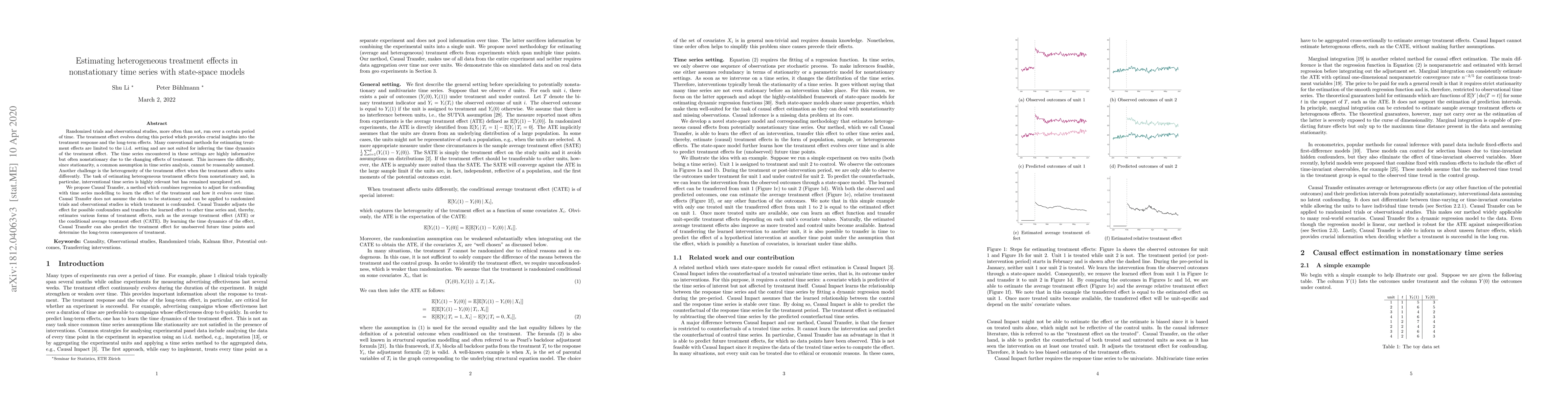 This paper proposes Causal Transfer, a novel method for estimating heterogeneous treatment effects in nonstationary time series data. Unlike traditional methods, Causal Transfer combines regression for confounding adjustment with time series modeling to account for the evolving treatment effect over time, providing insights into long-term consequences and various treatment effect measures.