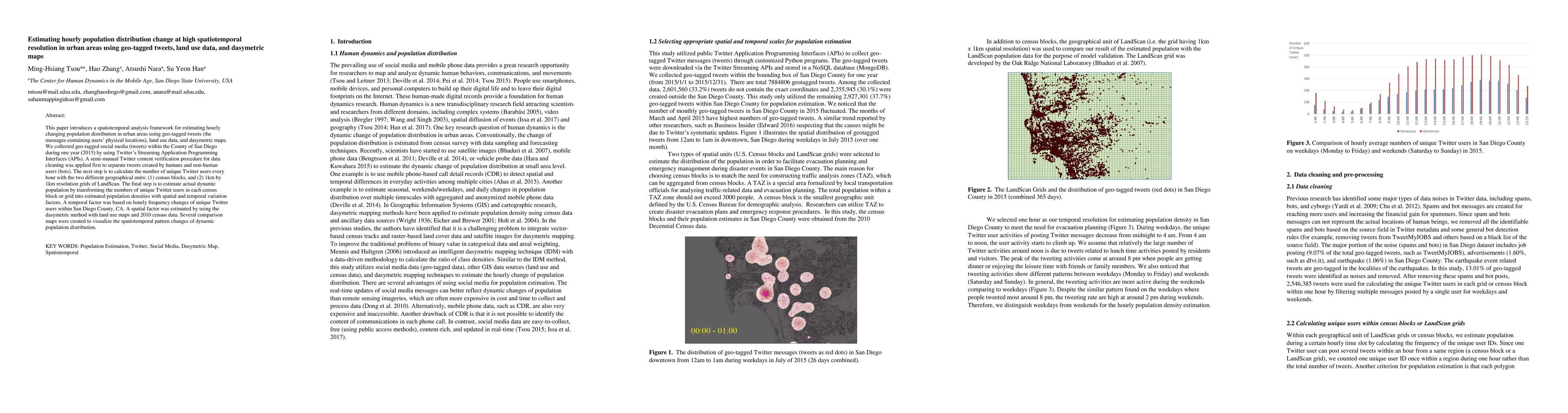This paper proposes a framework to estimate hourly population distribution changes in urban areas using geo-tagged tweets, land use data, and dasymetric maps. The study applies a semi-manual verification process on Twitter data to derive population densities at high spatiotemporal resolution in San Diego County.