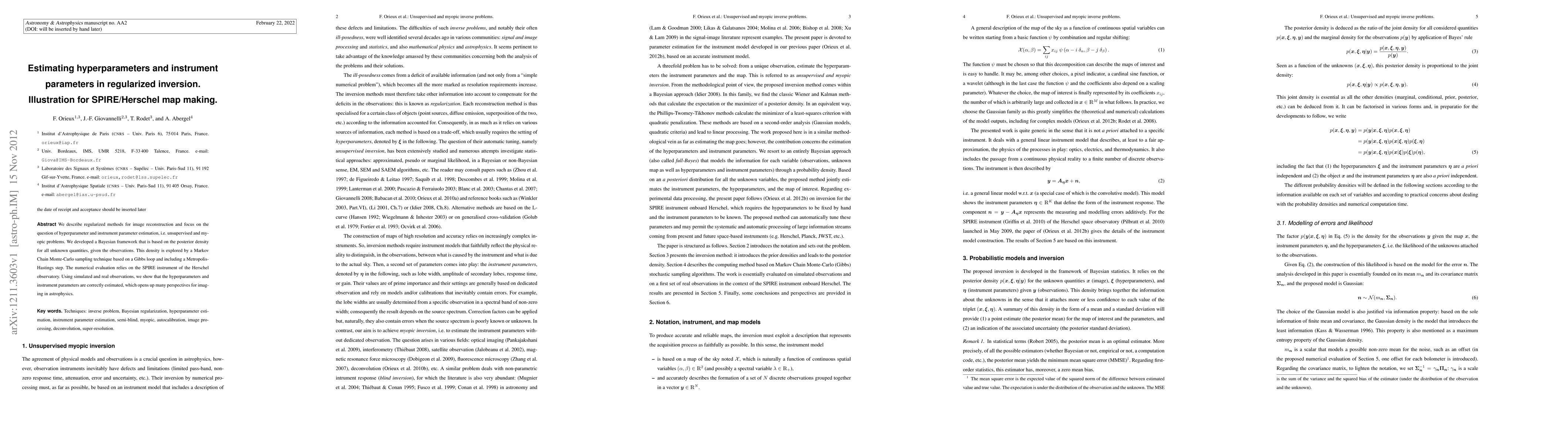 Researchers developed a Bayesian framework to estimate hyperparameters and instrument parameters in image reconstruction using SPIRE/Herschel data, successfully recovering correct values.