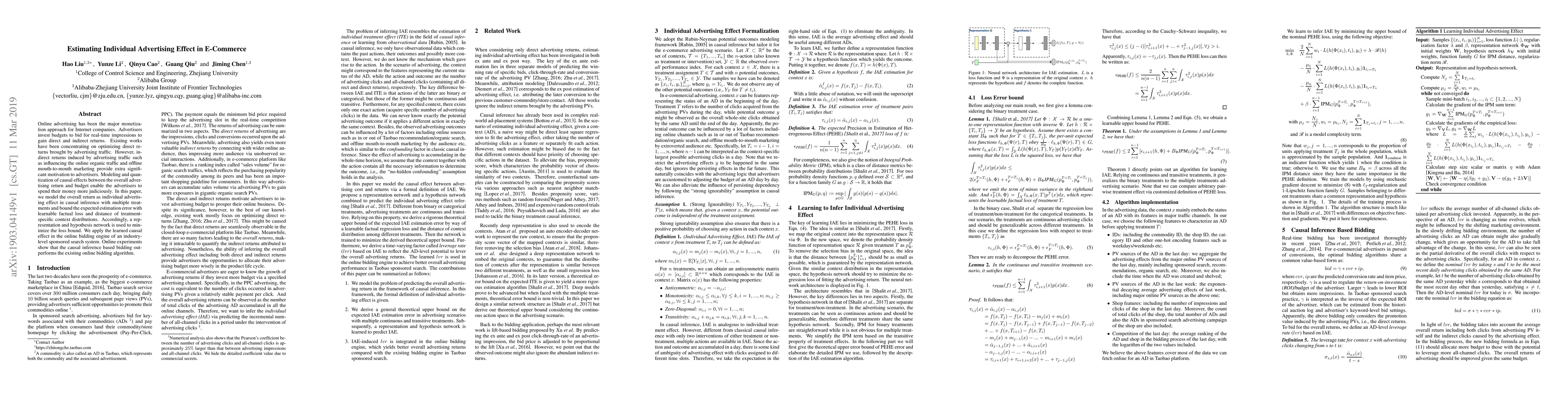 This paper proposes a method to estimate the individual advertising effect in e-commerce, focusing on both direct and indirect returns from online advertising. It utilizes causal inference to model the overall advertising return and optimizes the bidding strategy in an online bidding engine, demonstrating improved performance over existing algorithms.