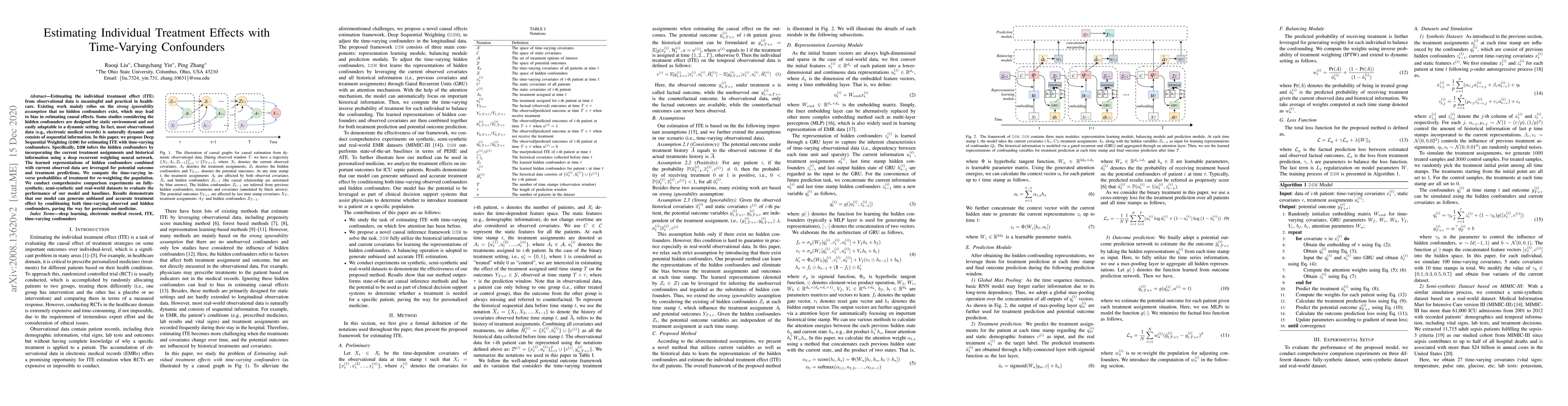 Estimating the individual treatment effect (ITE) from observational data is meaningful and practical in healthcare. Existing work mainly relies on the strong ignorability assumption that no hidden confounders exist, which may lead to bias in estimating causal effects. Some studies consider the hidden confounders are designed for static environment and not easily adaptable to a dynamic setting. In fact, most observational data (e.g., electronic medical records) is naturally dynamic and consists of sequential information. In this paper, we propose Deep Sequential Weighting (DSW) for estimating ITE with time-varying confounders. Specifically, DSW infers the hidden confounders by incorporating the current treatment assignments and historical information using a deep recurrent weighting neural network. The learned representations of hidden confounders combined with current observed data are leveraged for potential outcome and treatment predictions. We compute the time-varying inverse probabilities of treatment for re-weighting the population. We conduct comprehensive comparison experiments on fully-synthetic, semi-synthetic and real-world datasets to evaluate the performance of our model and baselines. Results demonstrate that our model can generate unbiased and accurate treatment effect by conditioning both time-varying observed and hidden confounders, paving the way for personalized medicine.