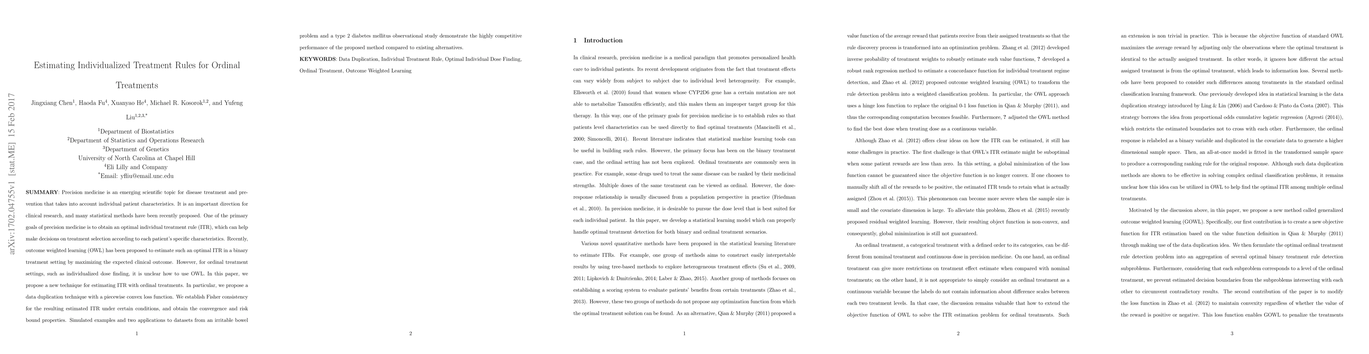 This paper proposes a novel technique for estimating individualized treatment rules (ITR) in ordinal treatment settings, utilizing a data duplication method with a piecewise convex loss function. The method demonstrates competitive performance in simulated examples and real-world applications for conditions like irritable bowel syndrome and type 2 diabetes.