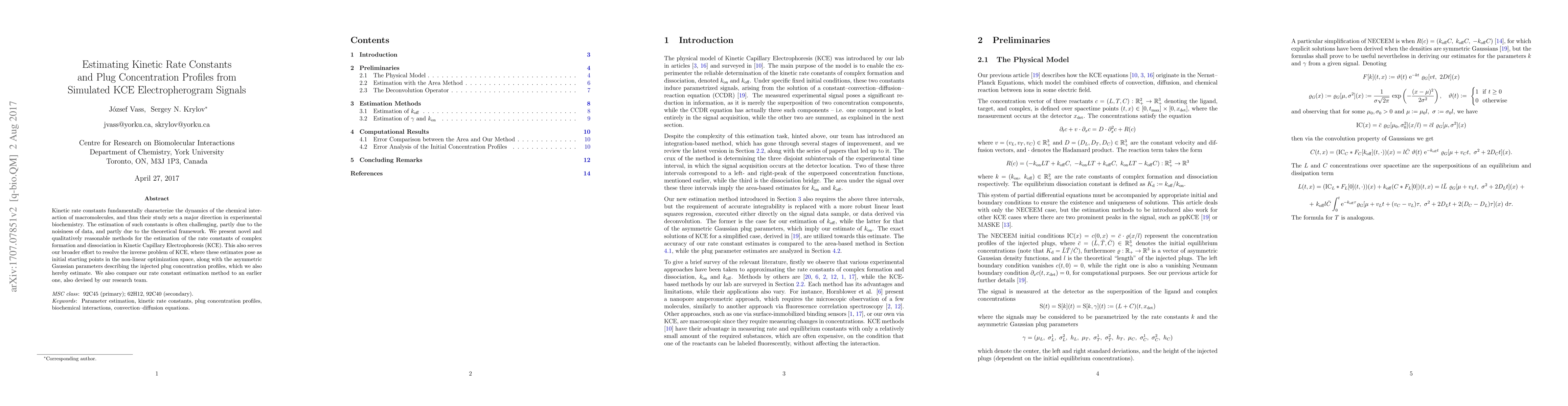 This paper presents new methods for estimating kinetic rate constants and plug concentration profiles from simulated KCE electropherogram signals, addressing the challenges posed by noisy data and theoretical frameworks. The proposed approach is compared to previous methods to demonstrate its effectiveness.