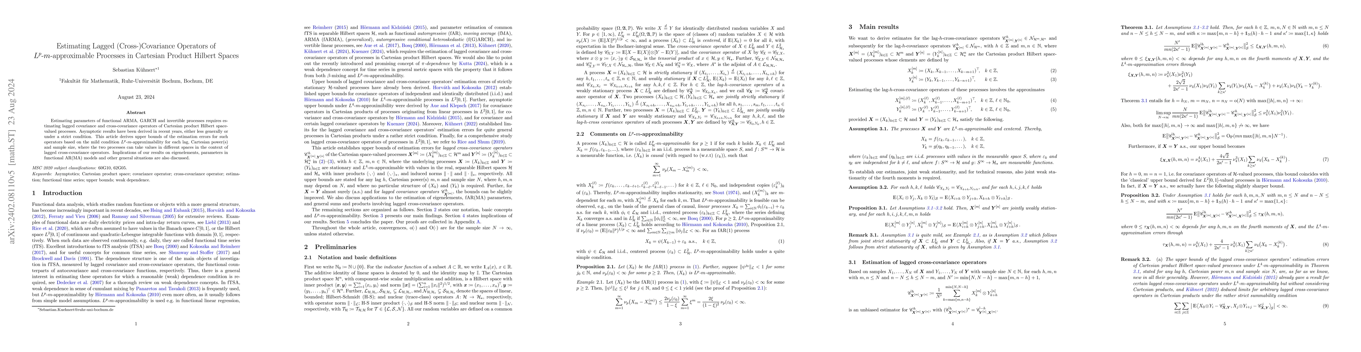 This paper develops upper bounds for the estimation errors of lagged covariance and cross-covariance operators in Cartesian product Hilbert spaces, based on Lp-m-approximability. The results have implications for functional ARMA, GARCH, and invertible processes, providing insights into parameters and eigenelements.