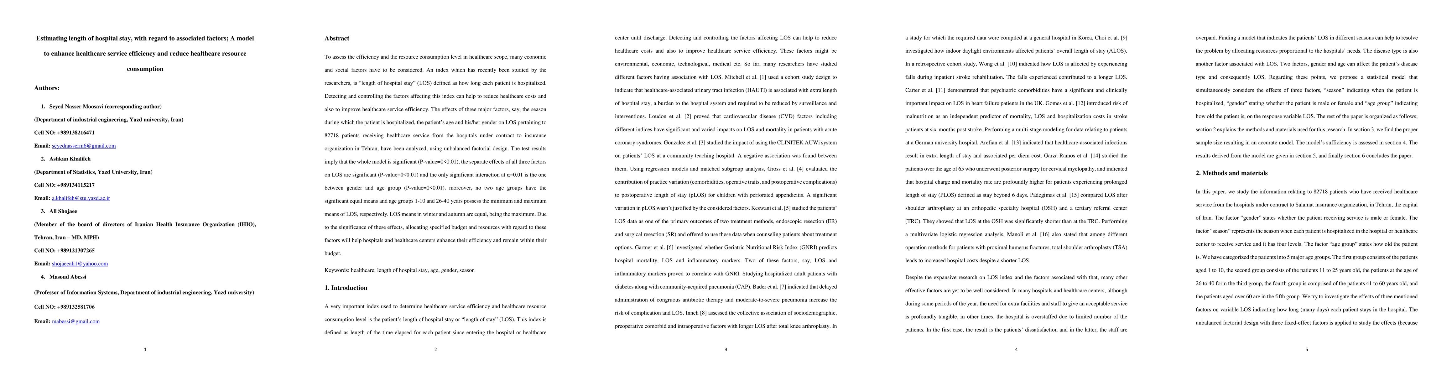 This study analyzes the length of hospital stay (LOS) in Tehran hospitals, finding significant effects of season, patient age, and gender on LOS. The model's results suggest that resource allocation based on these factors can improve healthcare efficiency and reduce costs.