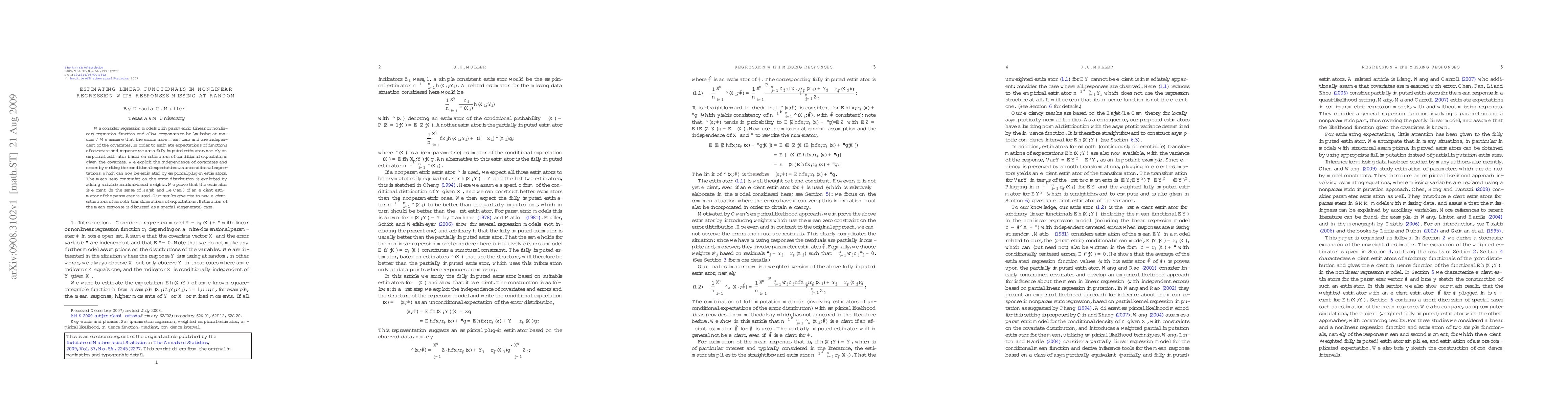 We consider regression models with parametric (linear or nonlinear) regression function and allow responses to be ``missing at random.'' We assume that the errors have mean zero and are independent of the covariates. In order to estimate expectations of functions of covariate and response we use a fully imputed estimator, namely an empirical estimator based on estimators of conditional expectations given the covariate. We exploit the independence of covariates and errors by writing the conditional expectations as unconditional expectations, which can now be estimated by empirical plug-in estimators. The mean zero constraint on the error distribution is exploited by adding suitable residual-based weights. We prove that the estimator is efficient (in the sense of H\'{a}jek and Le Cam) if an efficient estimator of the parameter is used. Our results give rise to new efficient estimators of smooth transformations of expectations. Estimation of the mean response is discussed as a special (degenerate) case.
