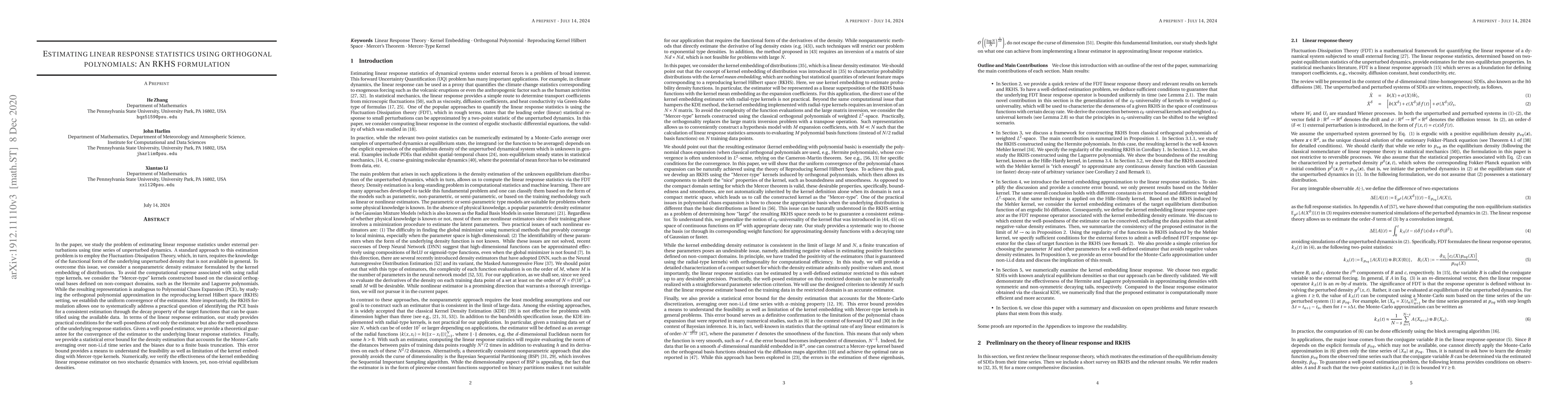 This paper proposes a nonparametric density estimator for estimating linear response statistics using orthogonal polynomials within a Reproducing Kernel Hilbert Space (RKHS) framework. It establishes uniform convergence and provides a statistical error bound, addressing the practical challenge of identifying the Polynomial Chaos Expansion basis for consistent estimation.