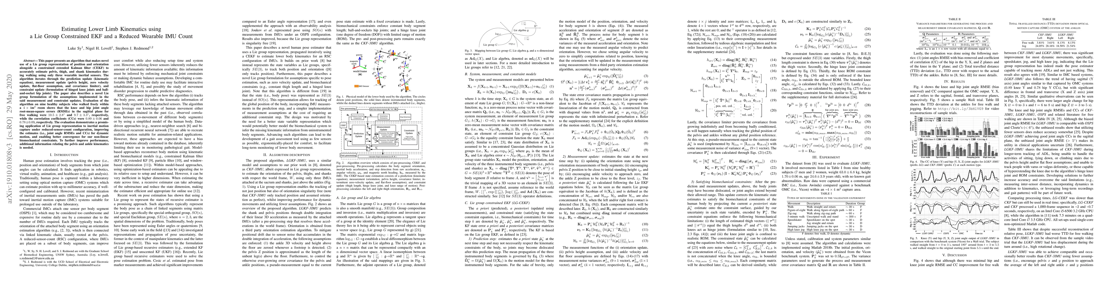 This paper presents an algorithm that makes novel use of a Lie group representation of position and orientation alongside a constrained extended Kalman filter (CEKF) to accurately estimate pelvis, thigh, and shank kinematics during walking using only three wearable inertial sensors. The algorithm iterates through the prediction update (kinematic equation), measurement update (pelvis height, zero velocity update, flat-floor assumption, and covariance limiter), and constraint update (formulation of hinged knee joints and ball-and-socket hip joints). The paper also describes a novel Lie group formulation of the assumptions implemented in the said measurement and constraint updates. Evaluation of the algorithm on nine healthy subjects who walked freely within a $4 \times 4$ m$^2$ room shows that the knee and hip joint angle root-mean-square errors (RMSEs) in the sagittal plane for free walking were $10.5 \pm 2.8^\circ$ and $9.7 \pm 3.3^\circ$, respectively, while the correlation coefficients (CCs) were $0.89 \pm 0.06$ and $0.78 \pm 0.09$, respectively. The evaluation demonstrates a promising application of Lie group representation to inertial motion capture under reduced-sensor-count configuration, improving the estimates (i.e., joint angle RMSEs and CCs) for dynamic motion, and enabling better convergence for our non-linear biomechanical constraints. To further improve performance, additional information relating the pelvis and ankle kinematics is needed.