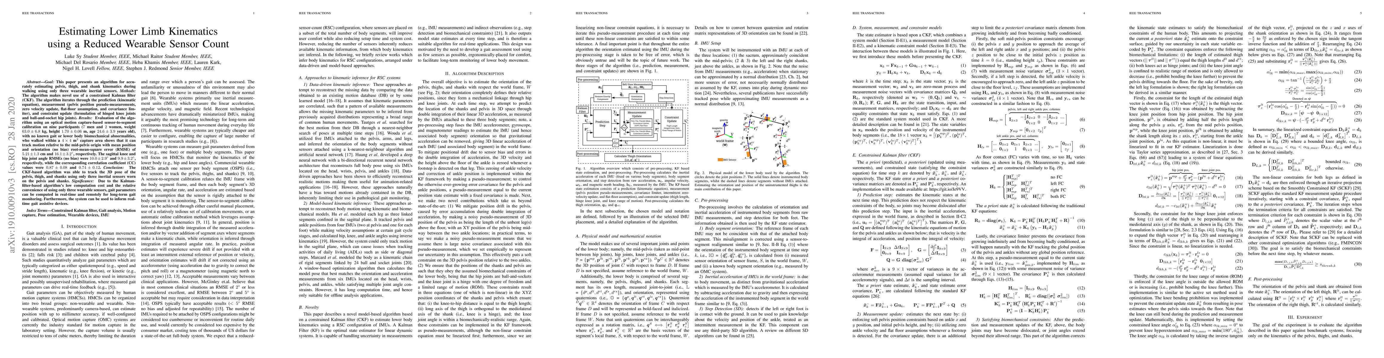 Goal: This paper presents an algorithm for accurately estimating pelvis, thigh, and shank kinematics during walking using only three wearable inertial sensors. Methods: The algorithm makes novel use of a constrained Kalman filter (CKF). The algorithm iterates through the prediction (kinematic equation), measurement (pelvis position pseudo-measurements, zero velocity update, flat-floor assumption, and covariance limiter), and constraint update (formulation of hinged knee joints and ball-and-socket hip joints). Results: Evaluation of the algorithm using an optical motion capture-based sensor-to-segment calibration on nine participants ($7$ men and $2$ women, weight $63.0 \pm 6.8$ kg, height $1.70 \pm 0.06$ m, age $24.6 \pm 3.9$ years old), with no known gait or lower body biomechanical abnormalities, who walked within a $4 \times 4$ m$^2$ capture area shows that it can track motion relative to the mid-pelvis origin with mean position and orientation (no bias) root-mean-square error (RMSE) of $5.21 \pm 1.3$ cm and $16.1 \pm 3.2^\circ$, respectively. The sagittal knee and hip joint angle RMSEs (no bias) were $10.0 \pm 2.9^\circ$ and $9.9 \pm 3.2^\circ$, respectively, while the corresponding correlation coefficient (CC) values were $0.87 \pm 0.08$ and $0.74 \pm 0.12$. Conclusion: The CKF-based algorithm was able to track the 3D pose of the pelvis, thigh, and shanks using only three inertial sensors worn on the pelvis and shanks. Significance: Due to the Kalman-filter-based algorithm's low computation cost and the relative convenience of using only three wearable sensors, gait parameters can be computed in real-time and remotely for long-term gait monitoring. Furthermore, the system can be used to inform real-time gait assistive devices.