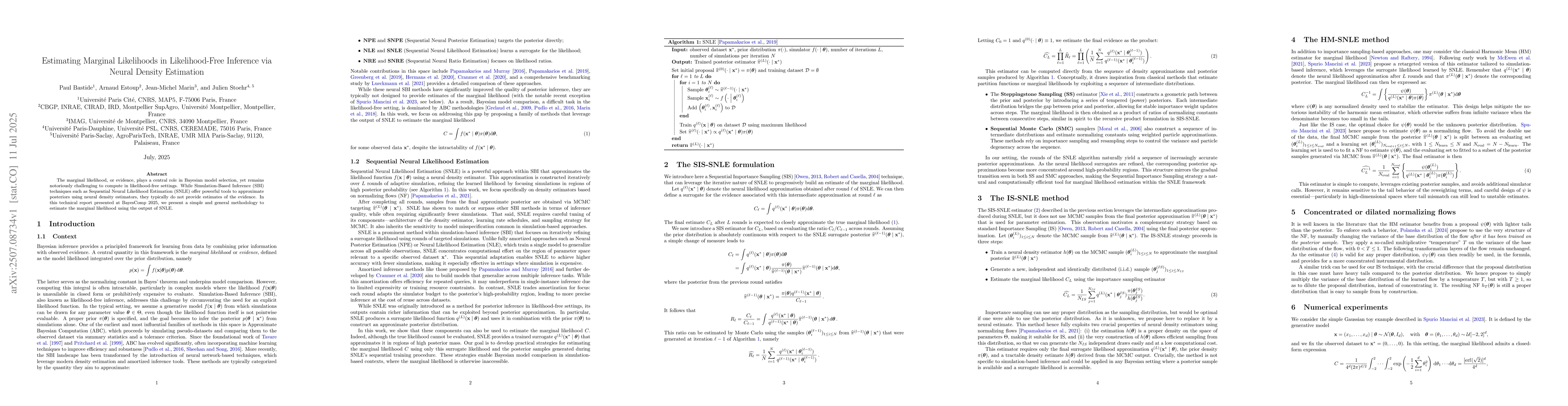 The marginal likelihood, or evidence, plays a central role in Bayesian model selection, yet remains notoriously challenging to compute in likelihood-free settings. While Simulation-Based Inference (SBI) techniques such as Sequential Neural Likelihood Estimation (SNLE) offer powerful tools to approximate posteriors using neural density estimators, they typically do not provide estimates of the evidence. In this technical report presented at BayesComp 2025, we present a simple and general methodology to estimate the marginal likelihood using the output of SNLE.