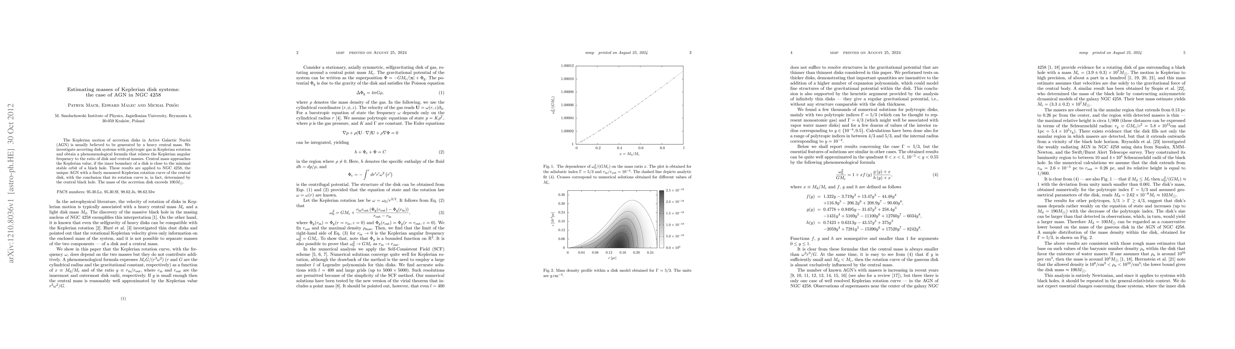 The Keplerian motion of accretion disks in Active Galactic Nuclei (AGN) is usually believed to be generated by a heavy central mass. We investigate accreting disk systems with polytropic gas in Keplerian rotation and obtain a phenomenological formula that relates the Keplerian angular frequency to the ratio of disk and central masses. Central mass approaches the Keplerian value, if the inner boundary of a disk is close to the minimal stable orbit of a black hole. These results are applied to NGC 4258, the unique AGN with a finely measured Keplerian rotation curve of the central disk, with the conclusion that its rotation curve is, in fact, determined by the central black hole. The mass of the accretion disk exceeds 100 solar masses.