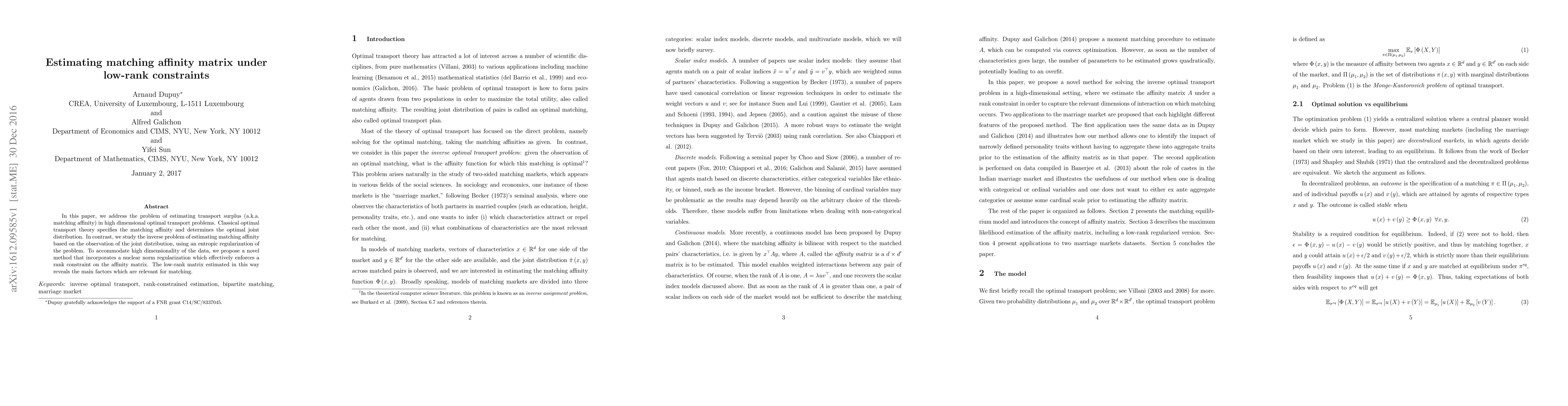 This paper introduces a method to estimate matching affinity in high-dimensional optimal transport problems using entropic regularization and nuclear norm constraints, effectively enforcing a low-rank structure on the affinity matrix, revealing key matching factors.