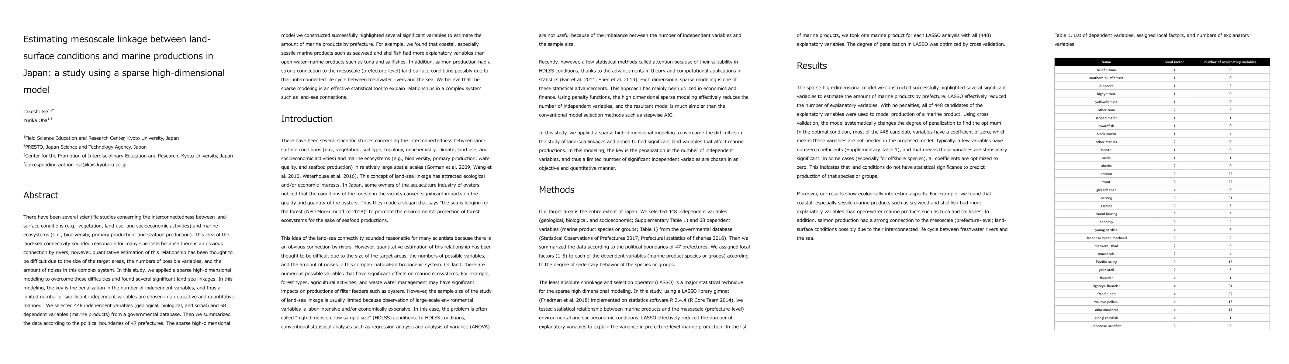 There have been several scientific studies concerning the interconnectedness between land-surface conditions (e.g., vegetation, land use, and socioeconomic activities) and marine ecosystems (e.g., biodiversity, primary production, and seafood production). This idea of the land-sea connectivity sounded reasonable for many scientists because there is an obvious connection by rivers, however, quantitative estimation of this relationship has been thought to be difficult due to the size of the target areas, the numbers of possible variables, and the amount of noises in this complex system. In this study, we applied a sparse high-dimensional modeling to overcome these difficulties and found several significant land-sea linkages. In this modeling, the key is the penalization in the number of independent variables, and thus a limited number of significant independent variables are chosen in an objective and quantitative manner. We selected 448 independent variables (geological, biological, and social) and 68 dependent variables (marine products) from a governmental database. Then we summarized the data according to the political boundaries of 47 prefectures. The sparse high-dimensional model we constructed successfully highlighted several significant variables to estimate the amount of marine products by prefecture. For example, we found that coastal, especially sessile marine products such as seaweed and shellfish had more explanatory variables than open-water marine products such as tuna and sailfishes. In addition, salmon production had a strong connection to the mesoscale (prefecture-level) land-surface conditions possibly due to their interconnected life cycle between freshwater rivers and the sea. We believe that the sparse modeling is an effective statistical tool to explain relationships in a complex system such as land-sea connections.