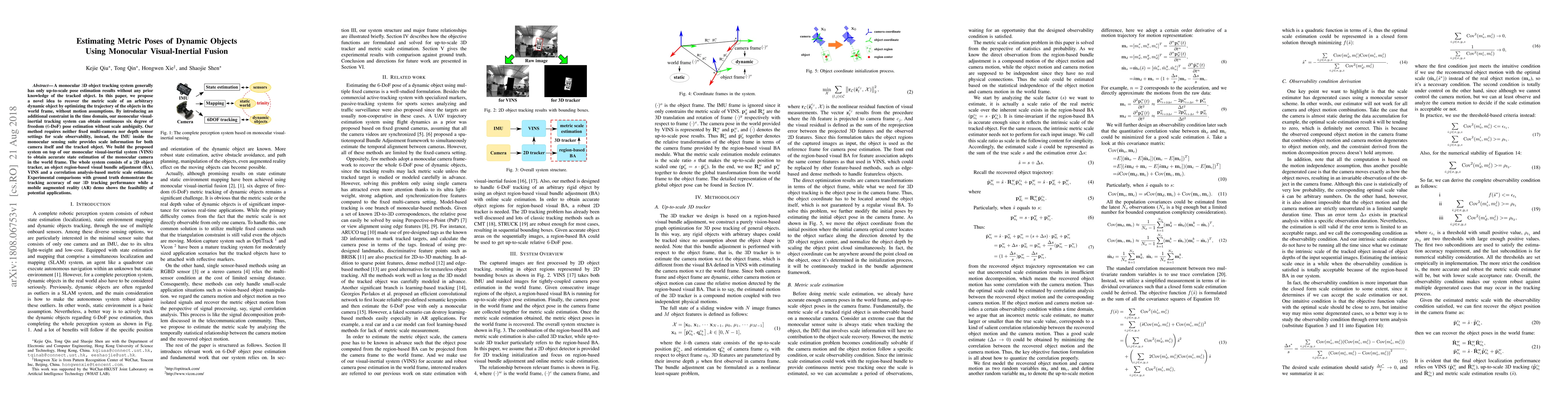 A monocular 3D object tracking system generally has only up-to-scale pose estimation results without any prior knowledge of the tracked object. In this paper, we propose a novel idea to recover the metric scale of an arbitrary dynamic object by optimizing the trajectory of the objects in the world frame, without motion assumptions. By introducing an additional constraint in the time domain, our monocular visual-inertial tracking system can obtain continuous six degree of freedom (6-DoF) pose estimation without scale ambiguity. Our method requires neither fixed multi-camera nor depth sensor settings for scale observability, instead, the IMU inside the monocular sensing suite provides scale information for both camera itself and the tracked object. We build the proposed system on top of our monocular visual-inertial system (VINS) to obtain accurate state estimation of the monocular camera in the world frame. The whole system consists of a 2D object tracker, an object region-based visual bundle adjustment (BA), VINS and a correlation analysis-based metric scale estimator. Experimental comparisons with ground truth demonstrate the tracking accuracy of our 3D tracking performance while a mobile augmented reality (AR) demo shows the feasibility of potential applications.