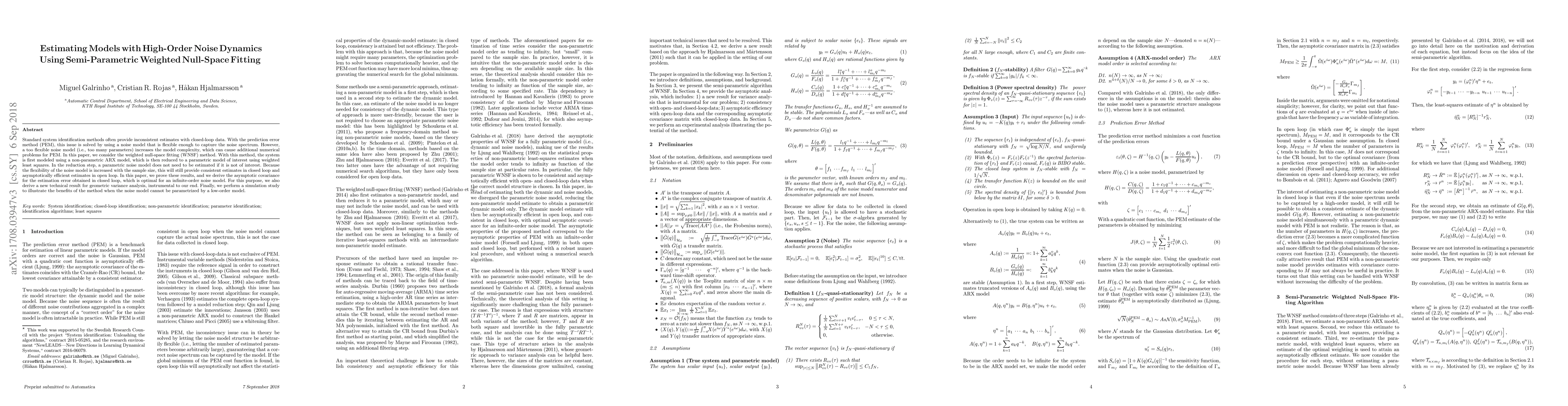 This paper proposes a semi-parametric weighted null-space fitting method for estimating models with high-order noise dynamics, addressing inconsistencies in standard system identification methods. The method uses a non-parametric ARX model followed by a reduction to a parametric model, avoiding the need for a complex parametric noise model, thus maintaining consistent estimates and efficiency.
