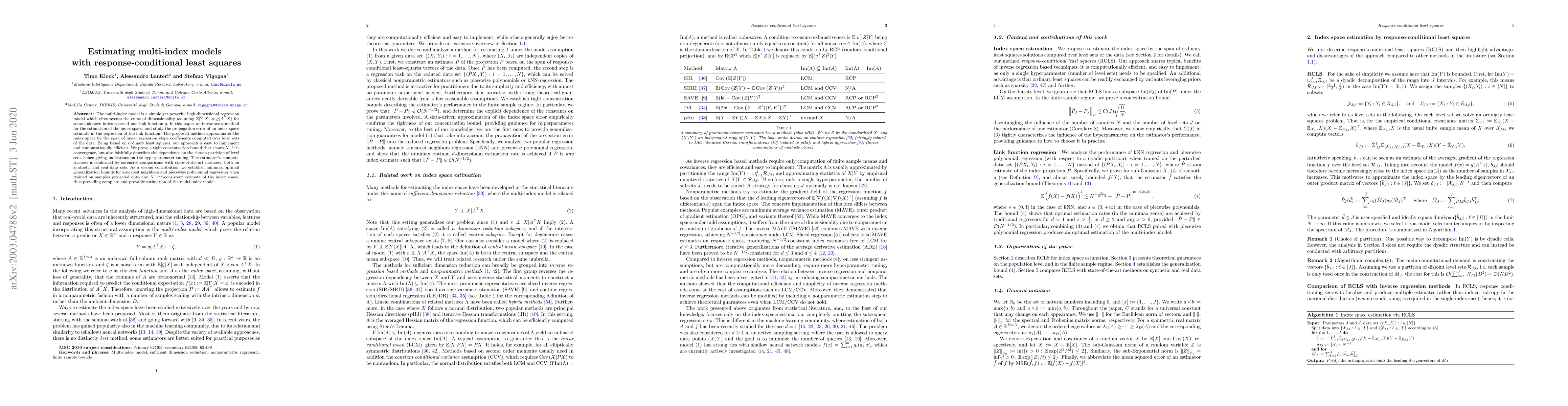 The multi-index model is a simple yet powerful high-dimensional regression model which circumvents the curse of dimensionality assuming $ \mathbb{E} [ Y | X ] = g(A^\top X) $ for some unknown index space $A$ and link function $g$. In this paper we introduce a method for the estimation of the index space, and study the propagation error of an index space estimate in the regression of the link function. The proposed method approximates the index space by the span of linear regression slope coefficients computed over level sets of the data. Being based on ordinary least squares, our approach is easy to implement and computationally efficient. We prove a tight concentration bound that shows $N^{-1/2}$-convergence, but also faithfully describes the dependence on the chosen partition of level sets, hence giving indications on the hyperparameter tuning. The estimator's competitiveness is confirmed by extensive comparisons with state-of-the-art methods, both on synthetic and real data sets. As a second contribution, we establish minimax optimal generalization bounds for k-nearest neighbors and piecewise polynomial regression when trained on samples projected onto any $N^{-1/2}$-consistent estimate of the index space, thus providing complete and provable estimation of the multi-index model.