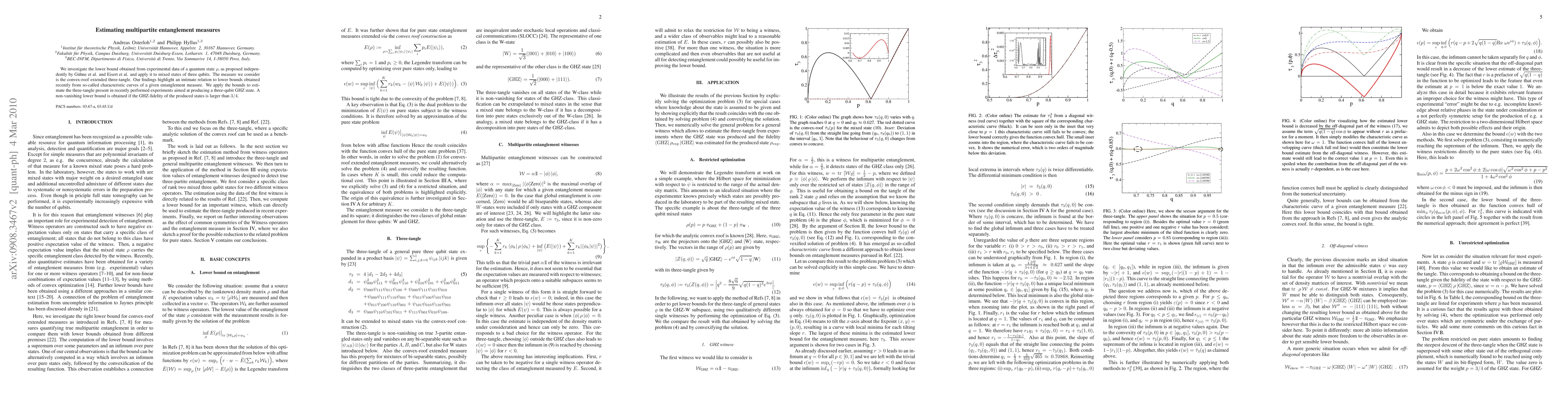 Researchers investigated a method to estimate multipartite entanglement in three-qubit systems using lower bounds from characteristic curves of the extended three-tangle measure. A non-vanishing lower bound is obtained if the GHZ-fidelity is above 3/4.