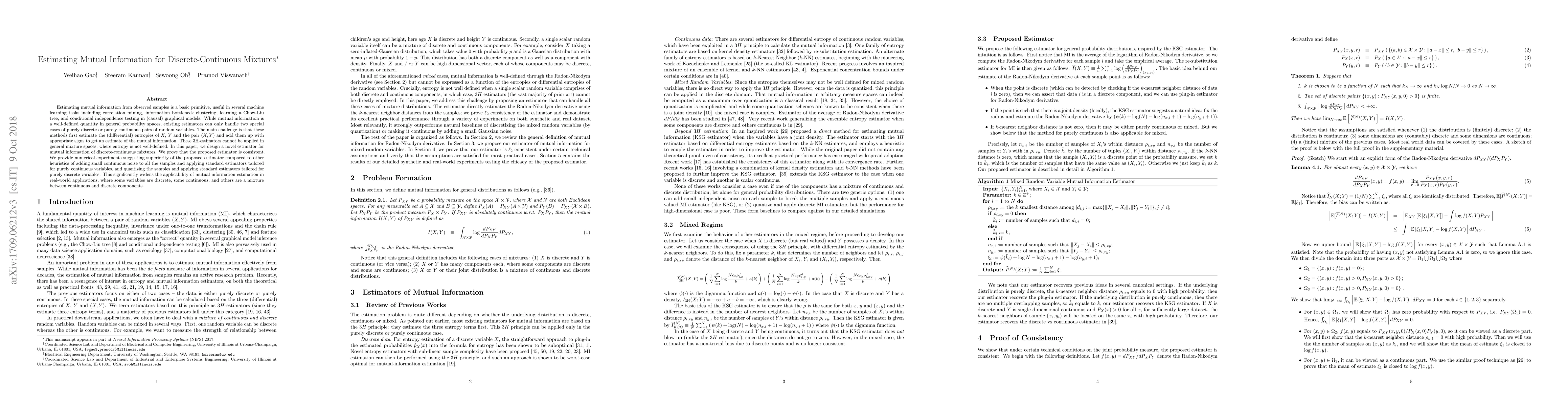 This paper introduces a novel estimator for mutual information in discrete-continuous mixtures, proving its consistency and demonstrating its superiority over existing methods in numerical experiments. This advancement significantly enhances the applicability of mutual information estimation in complex real-world scenarios involving mixed variable types.