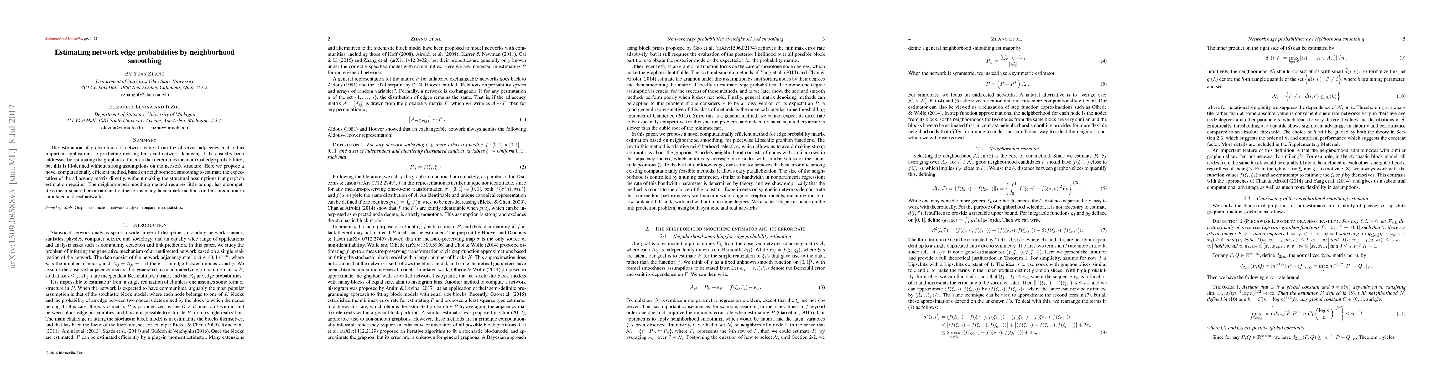 The estimation of probabilities of network edges from the observed adjacency matrix has important applications to predicting missing links and network denoising. It has usually been addressed by estimating the graphon, a function that determines the matrix of edge probabilities, but this is ill-defined without strong assumptions on the network structure. Here we propose a novel computationally efficient method, based on neighborhood smoothing to estimate the expectation of the adjacency matrix directly, without making the structural assumptions that graphon estimation requires. The neighborhood smoothing method requires little tuning, has a competitive mean-squared error rate, and outperforms many benchmark methods on link prediction in simulated and real networks.