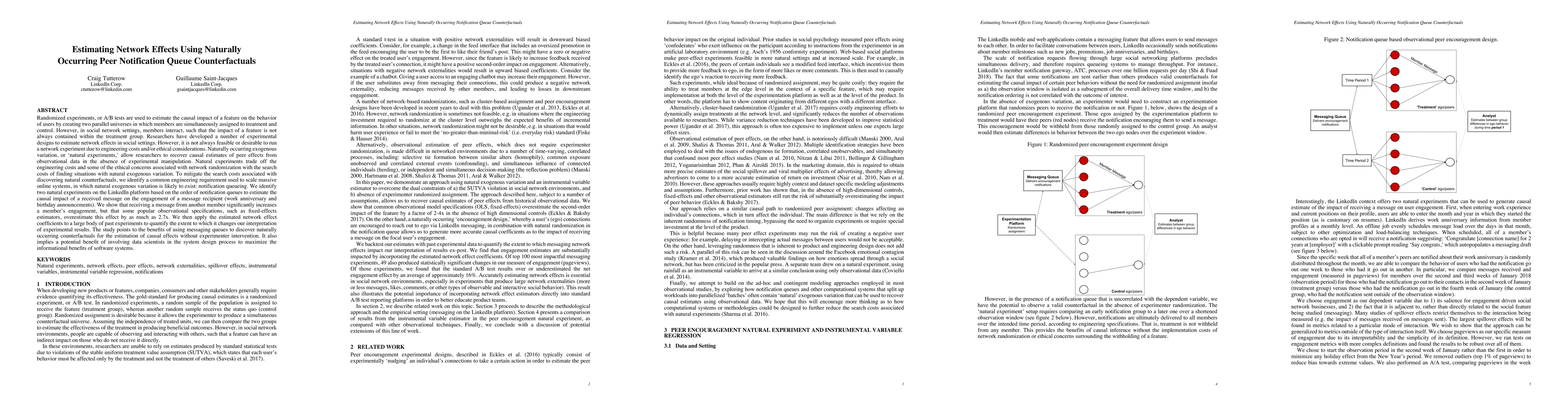 Randomized experiments, or A/B tests are used to estimate the causal impact of a feature on the behavior of users by creating two parallel universes in which members are simultaneously assigned to treatment and control. However, in social network settings, members interact, such that the impact of a feature is not always contained within the treatment group. Researchers have developed a number of experimental designs to estimate network effects in social settings. Alternatively, naturally occurring exogenous variation, or 'natural experiments,' allow researchers to recover causal estimates of peer effects from observational data in the absence of experimental manipulation. Natural experiments trade off the engineering costs and some of the ethical concerns associated with network randomization with the search costs of finding situations with natural exogenous variation. To mitigate the search costs associated with discovering natural counterfactuals, we identify a common engineering requirement used to scale massive online systems, in which natural exogenous variation is likely to exist: notification queueing. We identify two natural experiments on the LinkedIn platform based on the order of notification queues to estimate the causal impact of a received message on the engagement of a recipient. We show that receiving a message from another member significantly increases a member's engagement, but that some popular observational specifications, such as fixed-effects estimators, overestimate this effect by as much as 2.7x. We then apply the estimated network effect coefficients to a large body of past experiments to quantify the extent to which it changes our interpretation of experimental results. The study points to the benefits of using messaging queues to discover naturally occurring counterfactuals for the estimation of causal effects without experimenter intervention.