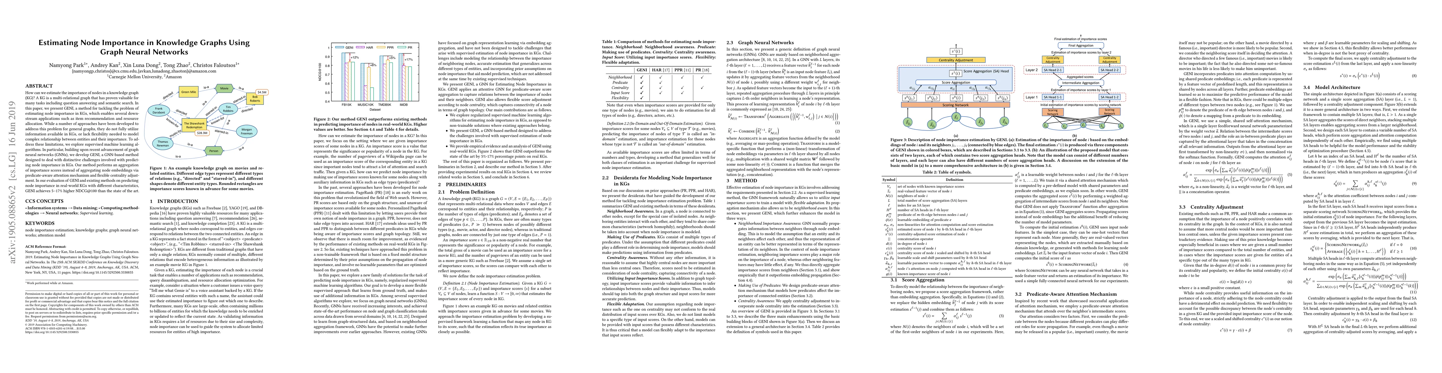 This paper proposes GENI, a graph neural network (GNN) method to estimate node importance in knowledge graphs (KGs) by aggregating importance scores using a predicate-aware attention mechanism and centrality adjustment. GENI outperforms existing methods by achieving 5-17% higher NDCG@100 on real-world KGs.