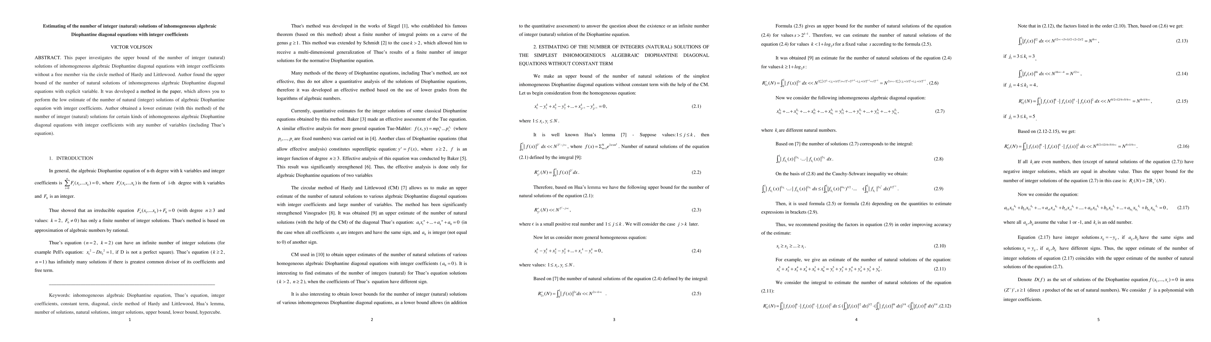 This paper investigates the upper bound of the number of integer (natural) solutions of inhomogeneous algebraic Diophantine diagonal equations with integer coefficients without a free member via the circle method of Hardy and Littlewood. Author found the upper bound of the number of natural solutions of inhomogeneous algebraic Diophantine diagonal equations with explicit variable. He developed a method in the paper, which allows you to perform the low estimate of the number of natural (integer) solutions of algebraic Diophantine equation with integer coefficients. Author obtained a lower estimate (with this method) of the number of integer (natural) solutions for certain kinds of inhomogeneous algebraic Diophantine diagonal equations with integer coefficients with any number of variables (including Thue equation).