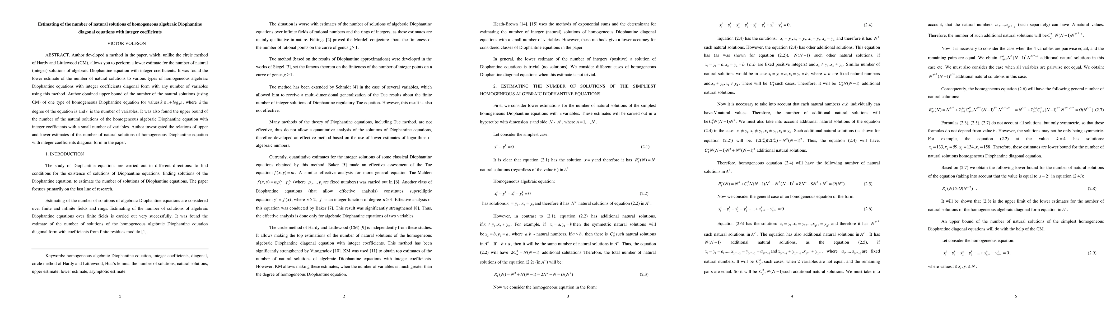 This paper introduces a novel method for estimating the number of natural solutions to homogeneous algebraic Diophantine diagonal equations with integer coefficients, providing a lower estimate that surpasses the circle method. It also establishes upper bounds for specific types of these equations using the circle method.