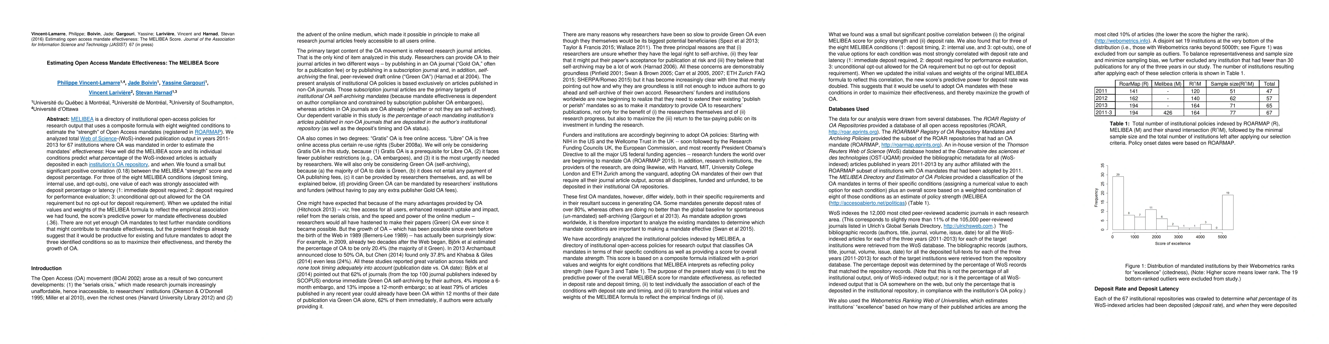 MELIBEA is a Spanish database that uses a composite formula with eight weighted conditions to estimate the effectiveness of Open Access mandates (registered in ROARMAP). We analyzed 68 mandated institutions for publication years 2011-2013 to determine how well the MELIBEA score and its individual conditions predict what percentage of published articles indexed by Web of Knowledge is deposited in each institution's OA repository, and when. We found a small but significant positive correlation (0.18) between MELIBEA score and deposit percentage. We also found that for three of the eight MELIBEA conditions (deposit timing, internal use, and opt-outs), one value of each was strongly associated with deposit percentage or deposit latency (immediate deposit required, deposit required for performance evaluation, unconditional opt-out allowed for the OA requirement but no opt-out for deposit requirement). When we updated the initial values and weights of the MELIBEA formula for mandate effectiveness to reflect the empirical association we had found, the score's predictive power doubled (.36). There are not yet enough OA mandates to test further mandate conditions that might contribute to mandate effectiveness, but these findings already suggest that it would be useful for future mandates to adopt these three conditions so as to maximize their effectiveness, and thereby the growth of OA.