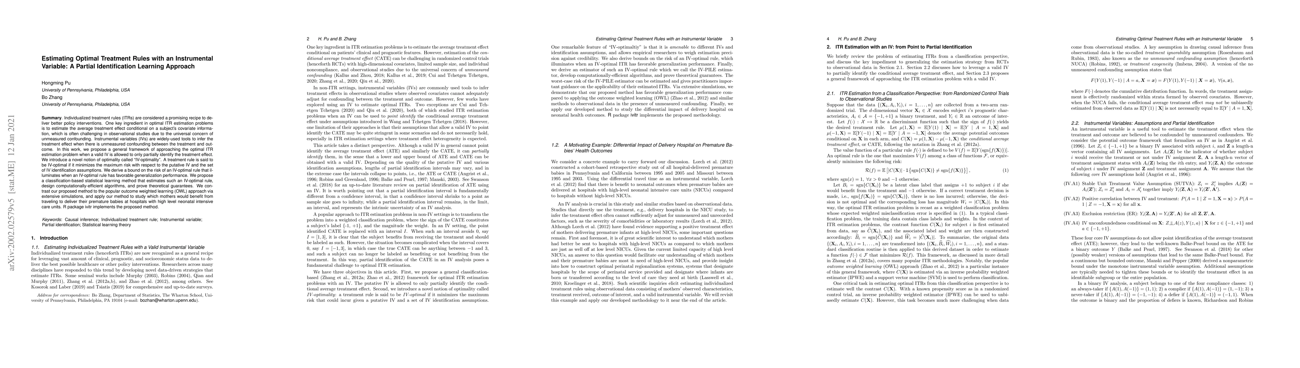 This paper proposes a novel partial identification learning approach to estimate optimal individualized treatment rules using instrumental variables (IVs) in the presence of unmeasured confounding. It introduces "IV-optimality" and provides a learning method to estimate such rules, contrasting it with outcome weighted learning (OWL) and demonstrating its application in neonatal care.