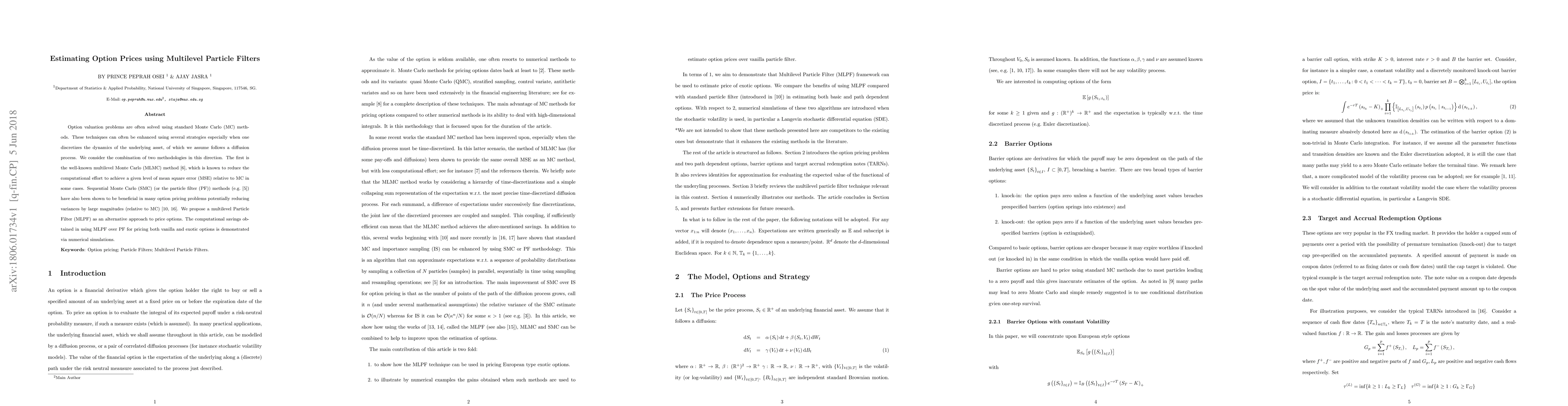This research proposes a new method called multilevel particle filter (MLPF) to estimate option prices, offering computational savings for pricing both vanilla and exotic options compared to traditional Monte Carlo methods.