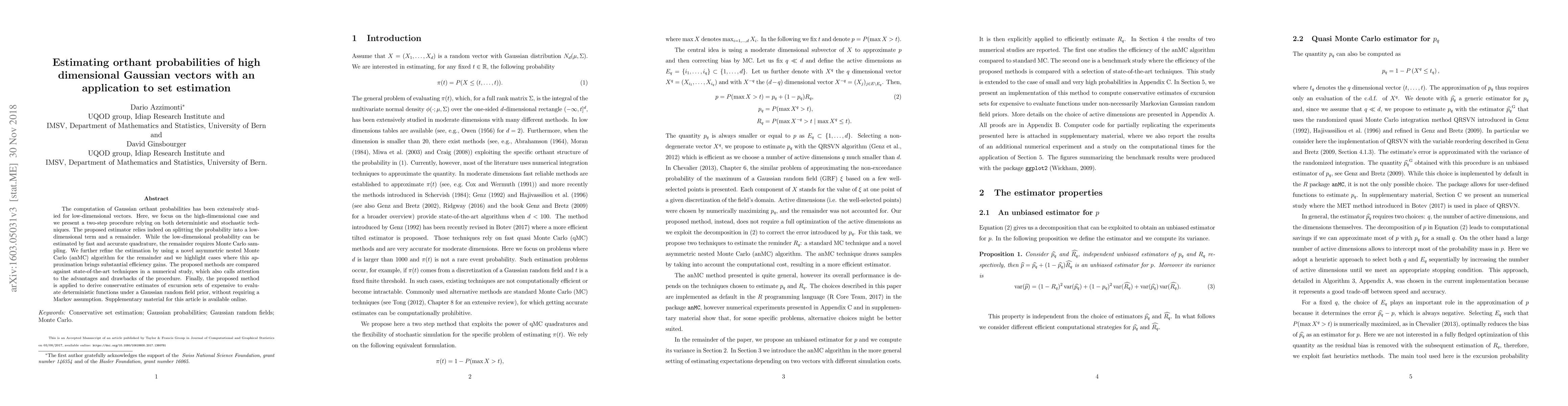 This paper proposes a two-step method for estimating high-dimensional Gaussian orthant probabilities using deterministic quadrature and an asymmetric nested Monte Carlo algorithm, demonstrating efficiency gains and applying it to set estimation in Gaussian random fields. The method is compared with state-of-the-art techniques and shown to provide conservative estimates of excursion sets.
