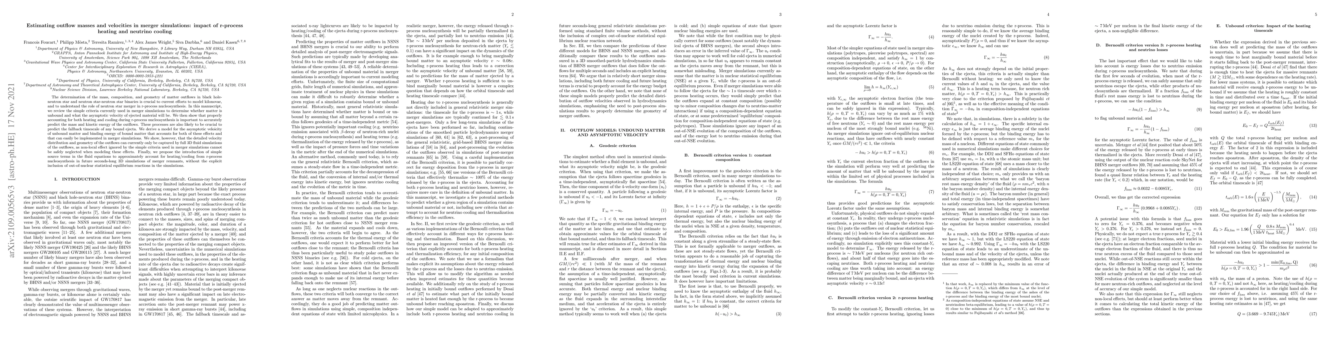 The determination of the mass, composition, and geometry of matter outflows in black hole-neutron star and neutron star-neutron star binaries is crucial to current efforts to model kilonovae, and to understand the role of neutron star merger in r-process nucleosynthesis. In this manuscript, we review the simple criteria currently used in merger simulations to determine whether matter is unbound and what the asymptotic velocity of ejected material will be. We then show that properly accounting for both heating and cooling during r-process nucleosynthesis is important to accurately predict the mass and kinetic energy of the outflows. These processes are also likely to be crucial to predict the fallback timescale of any bound ejecta. We derive a model for the asymptotic veloicity of unbound matter and binding energy of bound matter that accounts for both of these effects and that can easily be implemented in merger simulations. We show, however, that the detailed velocity distribution and geometry of the outflows can currently only be captured by full 3D fluid simulations of the outflows, as non-local effect ignored by the simple criteria used in merger simulations cannot be safely neglected when modeling these effects. Finally, we propose the introduction of simple source terms in the fluid equations to approximately account for heating/cooling from r-process nucleosynthesis in future seconds-long 3D simulations of merger remnants, without the explicit inclusion of out-of-nuclear statistical equilibrium reactions in the simulations.