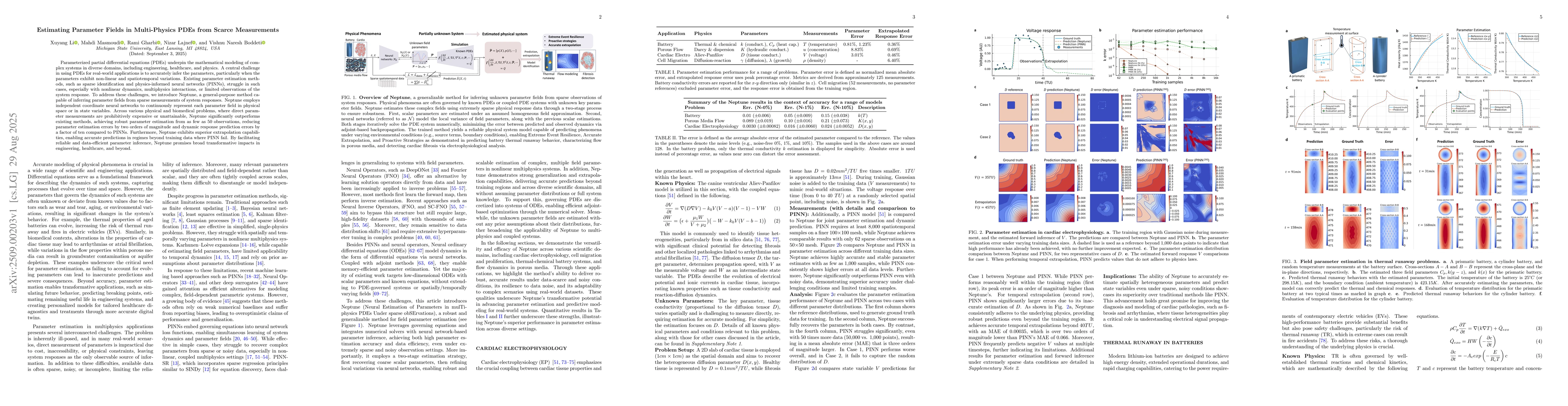 Parameterized partial differential equations (PDEs) underpin the mathematical modeling of complex systems in diverse domains, including engineering, healthcare, and physics. A central challenge in using PDEs for real-world applications is to accurately infer the parameters, particularly when the parameters exhibit non-linear and spatiotemporal variations. Existing parameter estimation methods, such as sparse identification and physics-informed neural networks (PINNs), struggle in such cases, especially with nonlinear dynamics, multiphysics interactions, or limited observations of the system response. To address these challenges, we introduce Neptune, a general-purpose method capable of inferring parameter fields from sparse measurements of system responses. Neptune employs independent coordinate neural networks to continuously represent each parameter field in physical space or in state variables. Across various physical and biomedical problems, where direct parameter measurements are prohibitively expensive or unattainable, Neptune significantly outperforms existing methods, achieving robust parameter estimation from as few as 50 observations, reducing parameter estimation errors by two orders of magnitude and dynamic response prediction errors by a factor of ten compared to PINNs. Furthermore, Neptune exhibits superior extrapolation capabilities, enabling accurate predictions in regimes beyond training data where PINN fail. By facilitating reliable and data-efficient parameter inference, Neptune promises broad transformative impacts in engineering, healthcare, and beyond.
