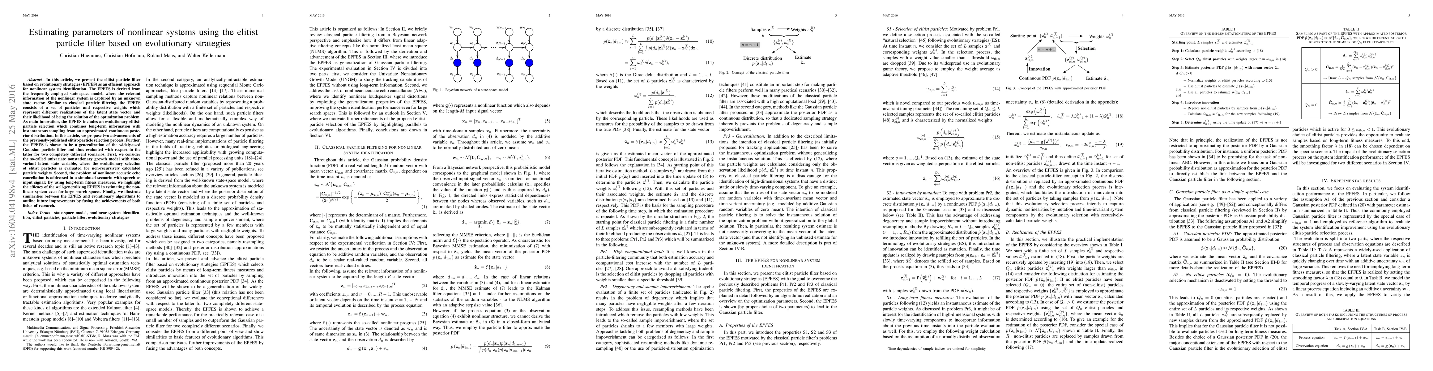 This paper introduces the elitist particle filter based on evolutionary strategies (EPFES) for identifying nonlinear systems. It proposes advancements in the elitist-particle selection process, combining long-term information with instantaneous sampling, and demonstrates its effectiveness in scenarios like nonstationary growth models and nonlinear acoustic echo cancellation.