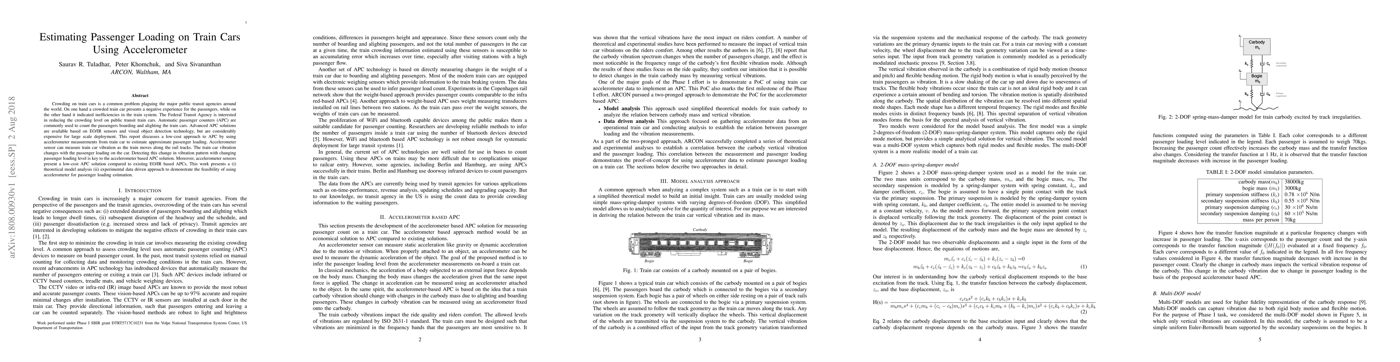 Crowding on train cars is a common problem plaguing the major public transit agencies around the world. On one hand a crowded train car presents a negative experience for the passengers, while on the other hand it indicated inefficiencies in the train system. The Federal Transit Agency is interested in reducing the crowding level on public transit train cars. Automatic passenger counters (APC) are commonly used to count the passengers boarding and alighting the train cars. Advanced APC solutions are available based on EO/IR sensors and visual object detection technology, but are considerably expensive for large scale deployment. This report discusses a low-cost approach to APC by using accelerometer measurements from train car to estimate approximate passenger loading. Accelerometer sensor can measure train car vibration as the train moves along the rail tracks. The train car vibration changes with the passenger loading on the car. Detecting this change in vibration pattern with changing passenger loading level is key to the accelerometer based APC solution. Moreover, accelerometer sensors present a low-cost APC solution compared to existing EO/IR based APCs. This work presents a (i) theoretical model analysis (ii) experimental data driven approach to demonstrate the feasibility of using accelerometer for passenger loading estimation.