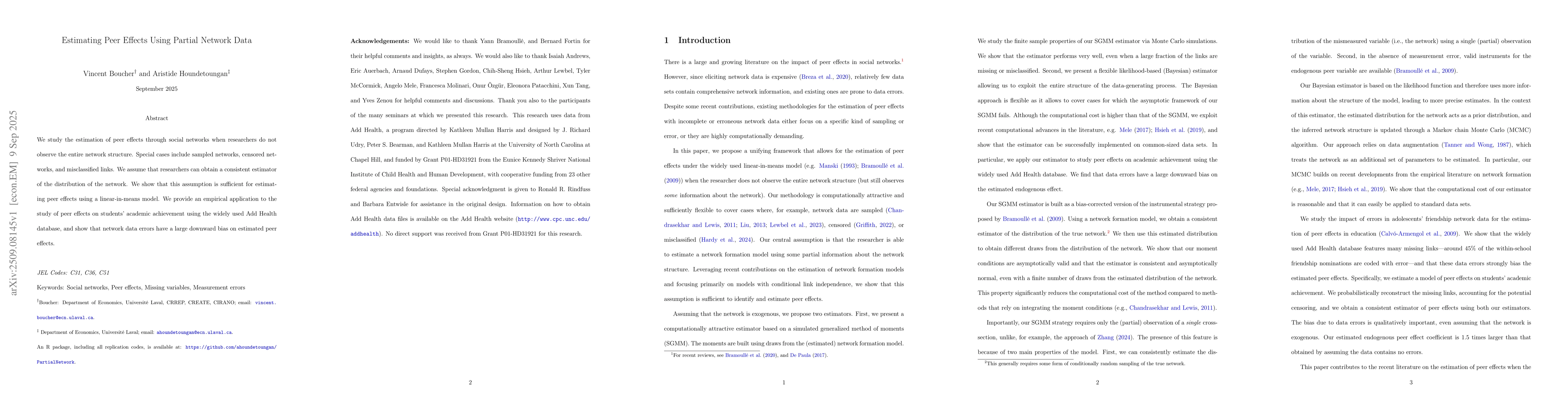 We study the estimation of peer effects through social networks when researchers do not observe the entire network structure. Special cases include sampled networks, censored networks, and misclassified links. We assume that researchers can obtain a consistent estimator of the distribution of the network. We show that this assumption is sufficient for estimating peer effects using a linear-in-means model. We provide an empirical application to the study of peer effects on students' academic achievement using the widely used Add Health database, and show that network data errors have a large downward bias on estimated peer effects.