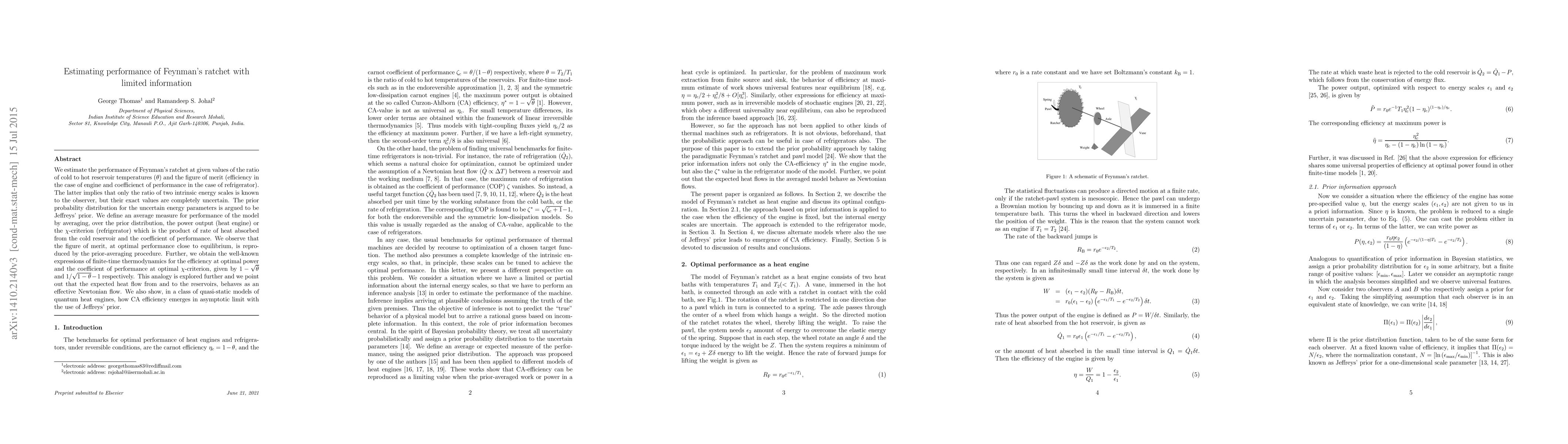 This paper estimates the performance of Feynman's ratchet under limited information about energy scales, using Jeffreys' prior. It finds that the figure of merit is reproduced and derives expressions for optimal efficiency and performance, showing an analogy to Newtonian flow and CA efficiency in quantum heat engines.