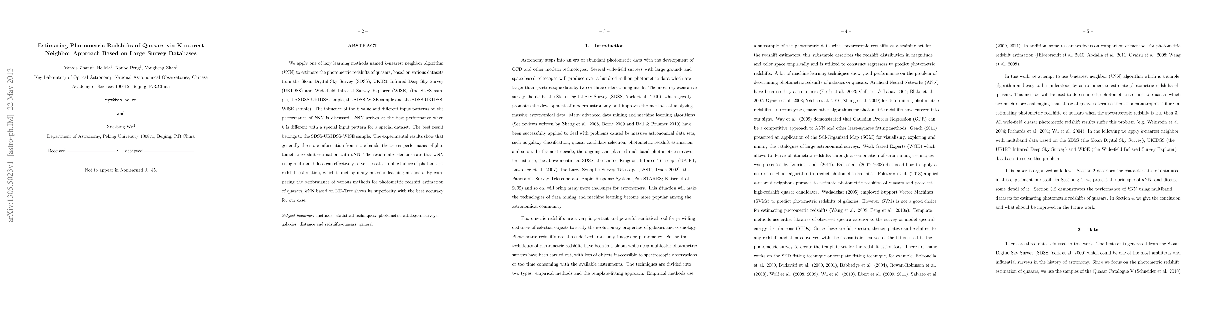 This paper uses the k-nearest neighbor (kNN) algorithm to estimate quasar photometric redshifts from large survey databases, finding that kNN performs best with different k values and input patterns for different datasets. The SDSS-UKIDSS-WISE sample yields the most accurate results, showing that multiband data enhances kNN's performance and mitigates common estimation failures.