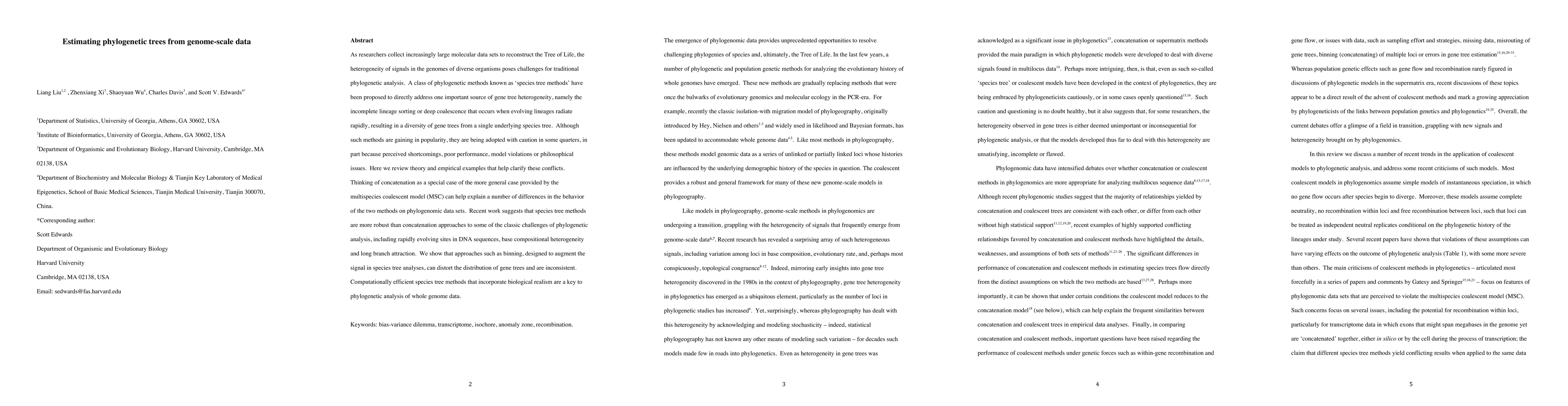 This paper reviews species tree methods for phylogenetic analysis, highlighting their robustness to challenges like rapidly evolving sites and compositional heterogeneity compared to concatenation methods. It discusses the conflicts between these methods and suggests that computational efficiency and biological realism are crucial for analyzing genome-scale data.