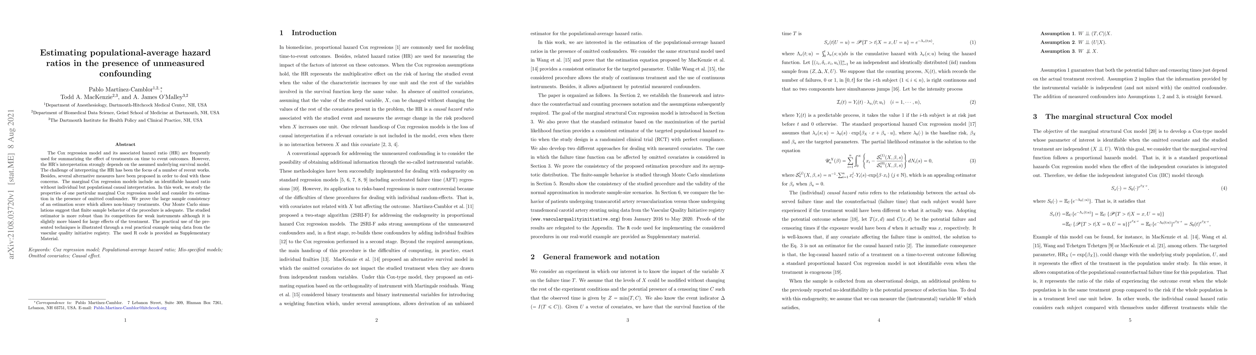 The Cox regression model and its associated hazard ratio (HR) are frequently used for summarizing the effect of treatments on time to event outcomes. However, the HR's interpretation strongly depends on the assumed underlying survival model. The challenge of interpreting the HR has been the focus of a number of recent works. Besides, several alternative measures have been proposed in order to deal with these concerns. The marginal Cox regression models include an identifiable hazard ratio without individual but populational causal interpretation. In this work, we study the properties of one particular marginal Cox regression model and consider its estimation in the presence of omitted confounder. We prove the large sample consistency of an estimation score which allows non-binary treatments. Our Monte Carlo simulations suggest that finite sample behavior of the procedure is adequate. The studied estimator is more robust than its competitors for weak instruments although it is slightly more biased for large effects of the treatment. The practical use of the presented techniques is illustrated through a real practical example using data from the vascular quality initiative registry. The used R code is provided as Supplementary Material.