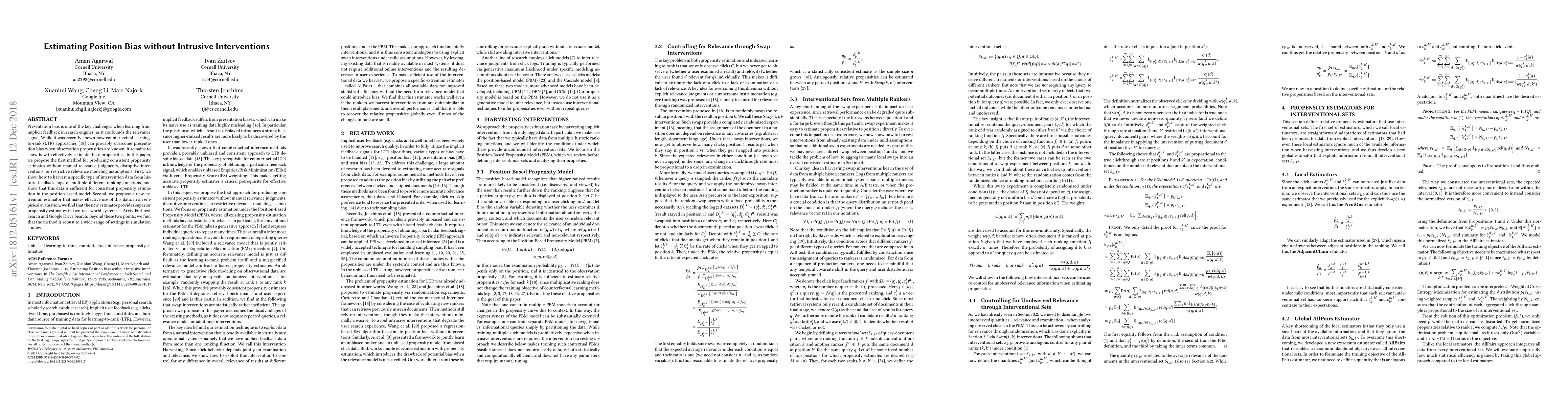 Presentation bias is one of the key challenges when learning from implicit feedback in search engines, as it confounds the relevance signal. While it was recently shown how counterfactual learning-to-rank (LTR) approaches \cite{Joachims/etal/17a} can provably overcome presentation bias when observation propensities are known, it remains to show how to effectively estimate these propensities. In this paper, we propose the first method for producing consistent propensity estimates without manual relevance judgments, disruptive interventions, or restrictive relevance modeling assumptions. First, we show how to harvest a specific type of intervention data from historic feedback logs of multiple different ranking functions, and show that this data is sufficient for consistent propensity estimation in the position-based model. Second, we propose a new extremum estimator that makes effective use of this data. In an empirical evaluation, we find that the new estimator provides superior propensity estimates in two real-world systems -- Arxiv Full-text Search and Google Drive Search. Beyond these two points, we find that the method is robust to a wide range of settings in simulation studies.