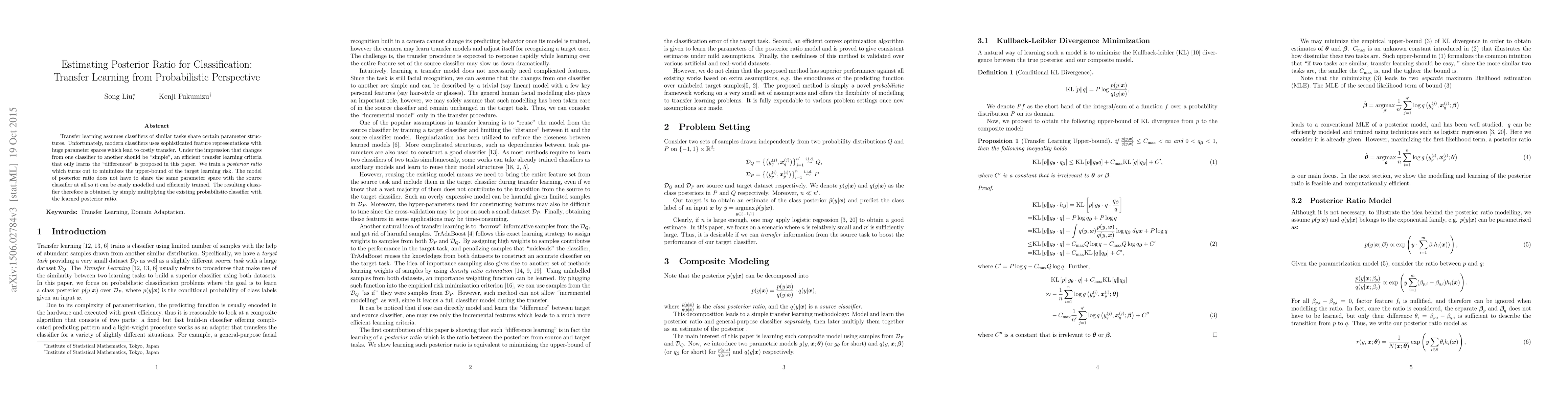 Researchers propose a new efficient method for transfer learning in classification tasks that minimizes target learning risk by training a posterior ratio model. This approach does not require sharing the same parameter space as the source classifier, making it easier to train and more flexible.