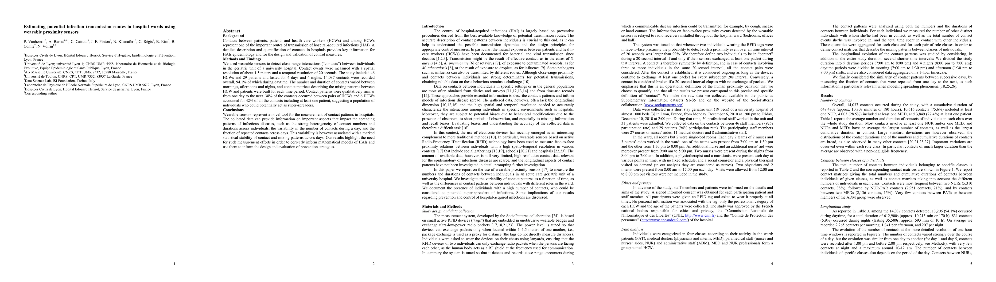 Contacts between patients, patients and health care workers (HCWs) and among HCWs represent one of the important routes of transmission of hospital-acquired infections (HAI). A detailed description and quantification of contacts in hospitals provides key information for HAIs epidemiology and for the design and validation of control measures. We used wearable sensors to detect close-range interactions ("contacts") between individuals in the geriatric unit of a university hospital. Contact events were measured with a spatial resolution of about 1.5 meters and a temporal resolution of 20 seconds. The study included 46 HCWs and 29 patients and lasted for 4 days and 4 nights. 14037 contacts were recorded. The number and duration of contacts varied between mornings, afternoons and nights, and contact matrices describing the mixing patterns between HCW and patients were built for each time period. Contact patterns were qualitatively similar from one day to the next. 38% of the contacts occurred between pairs of HCWs and 6 HCWs accounted for 42% of all the contacts including at least one patient, suggesting a population of individuals who could potentially act as super-spreaders. Wearable sensors represent a novel tool for the measurement of contact patterns in hospitals. The collected data provides information on important aspects that impact the spreading patterns of infectious diseases, such as the strong heterogeneity of contact numbers and durations across individuals, the variability in the number of contacts during a day, and the fraction of repeated contacts across days. This variability is associated with a marked statistical stability of contact and mixing patterns across days. Our results highlight the need for such measurement efforts in order to correctly inform mathematical models of HAIs and use them to inform the design and evaluation of prevention strategies.