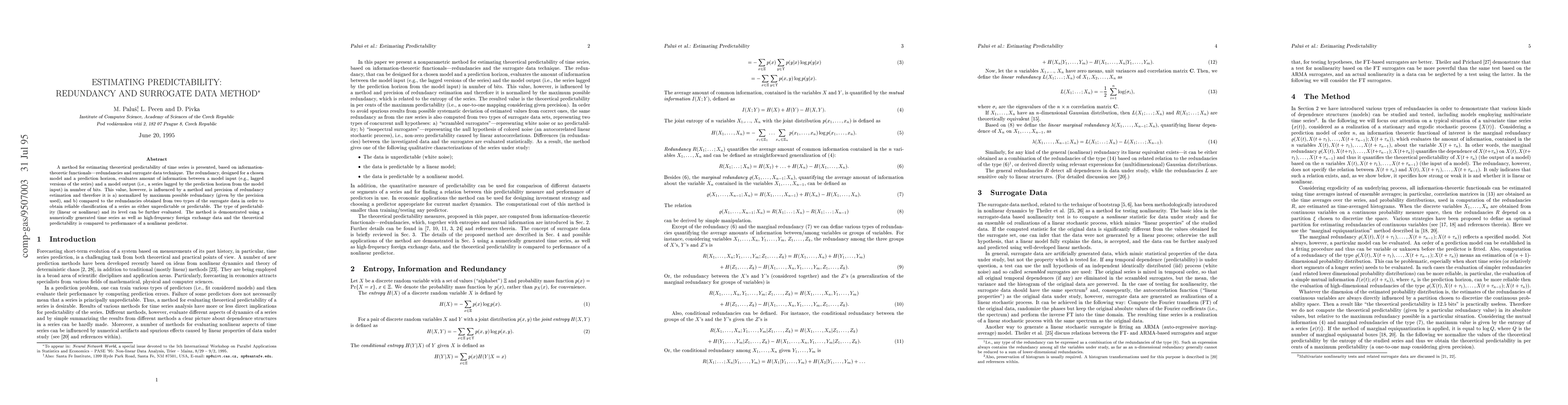 A method estimates predictability of time series using redundancy and surrogate data, allowing for classification as unpredictable or predictable. It outperforms a nonlinear predictor in theoretical predictability assessment.