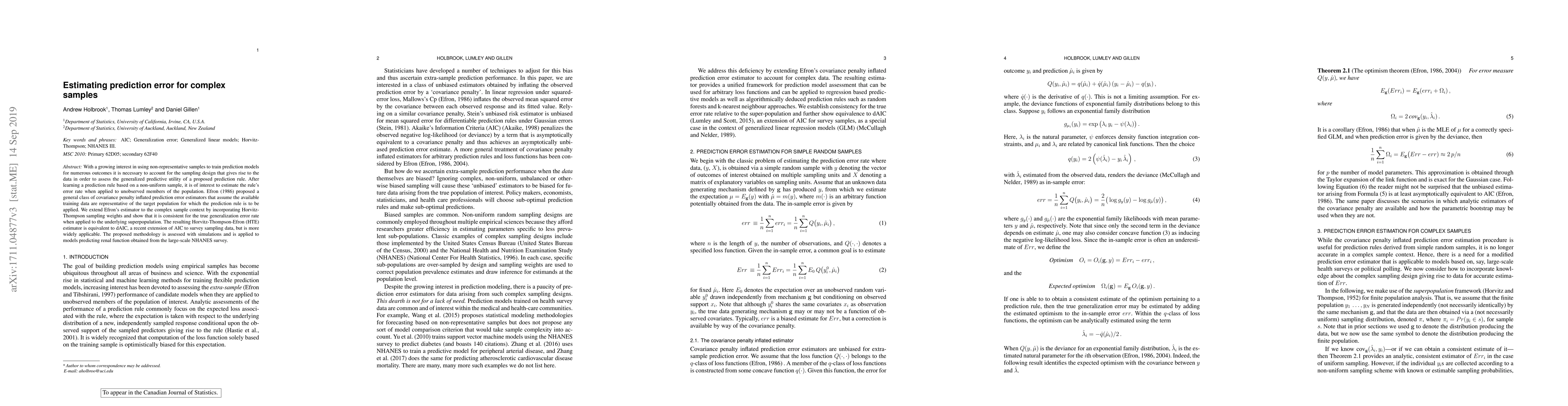 A new method for estimating prediction error in complex samples has been developed, using Horvitz-Thompson sampling weights to account for non-representative data, with promising results from simulations and real-world applications.