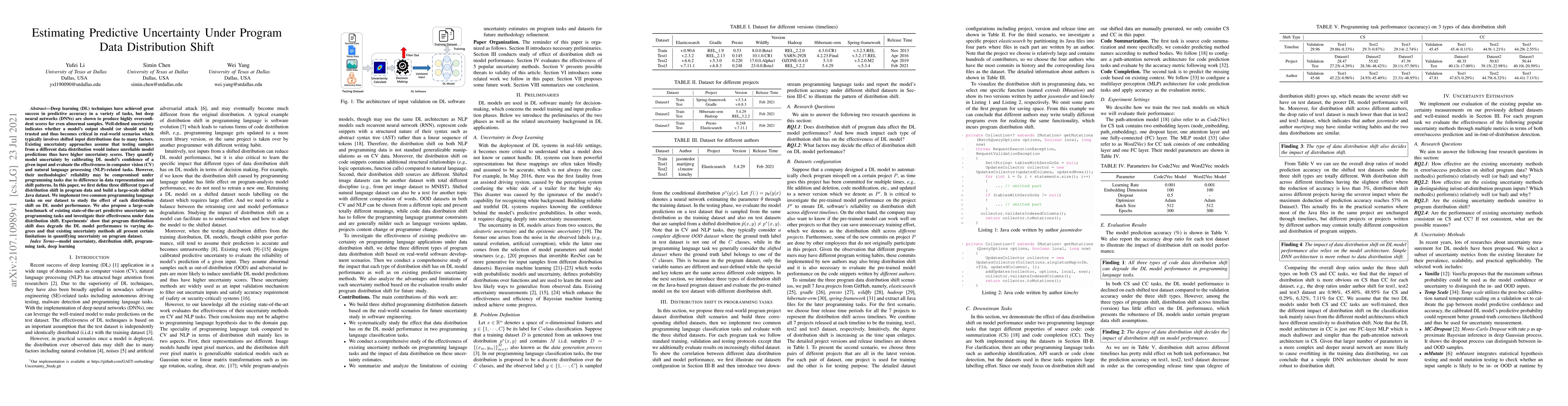 Deep learning (DL) techniques have achieved great success in predictive accuracy in a variety of tasks, but deep neural networks (DNNs) are shown to produce highly overconfident scores for even abnormal samples. Well-defined uncertainty indicates whether a model's output should (or should not) be trusted and thus becomes critical in real-world scenarios which typically involves shifted input distributions due to many factors. Existing uncertainty approaches assume that testing samples from a different data distribution would induce unreliable model predictions thus have higher uncertainty scores. They quantify model uncertainty by calibrating DL model's confidence of a given input and evaluate the effectiveness in computer vision (CV) and natural language processing (NLP)-related tasks. However, their methodologies' reliability may be compromised under programming tasks due to difference in data representations and shift patterns. In this paper, we first define three different types of distribution shift in program data and build a large-scale shifted Java dataset. We implement two common programming language tasks on our dataset to study the effect of each distribution shift on DL model performance. We also propose a large-scale benchmark of existing state-of-the-art predictive uncertainty on programming tasks and investigate their effectiveness under data distribution shift. Experiments show that program distribution shift does degrade the DL model performance to varying degrees and that existing uncertainty methods all present certain limitations in quantifying uncertainty on program dataset.